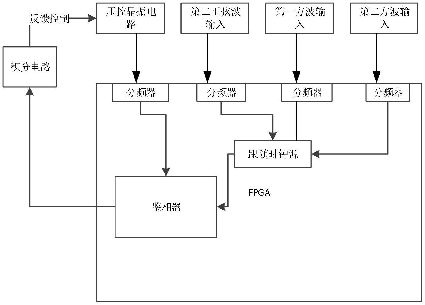 本实用新型提供一种锁相环,该锁相环的控制器分别与压控晶振电路、积分电路连接,积分电路分别与控制器、压控晶振电路连接;控制器为FPGA,不同的分频器对应不同的信号输入端口,控制器通过分频器、鉴相器对信号输入端口输入的信号进行分频、鉴相,并输出有效信号,跟随时钟源根据有效信号的数量和相位生成时钟信号;积分电路获取有效信号,将有效信号转换为电平信号输出给压控晶振电路,压控晶振电路根据时钟信号控制输出给控制器的反馈信号。本实用新型能实现多路时钟选源作用和实现多路时钟同时跟随,灵活性好,且无需另外设置配合电路,能够通过FPGA的特性实现其他功能的扩展,减少了占用空间,减少了开发周期和成本,提高了开发效率。