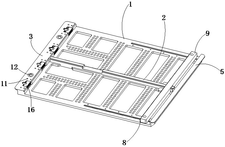 本实用新型涉及PCB加工设备领域,具体公开了一种拼板装置,包括基板,在所述基板的前后对称轴位置设置有横向定位梁,所述基板左端设置有左限位座,所述左限位座右端设置有压持组件,所述基板右端设置有右限位座,所述基板上纵向贯穿设置有排气孔,在所述横向定位梁前、后侧、位于所述基板上纵向贯穿设置有若干安放槽,所述横向定位梁上活动设置有移动杠,所述移动杠左表面上开设有固定槽。本实用新型通过设置压持组件以及移动杠配合使PCB板在加工的过程当中不会因为一端被施加了力而另一端翘起的情况,保证PCB板在贴片的过程当中不会跳出本装置。