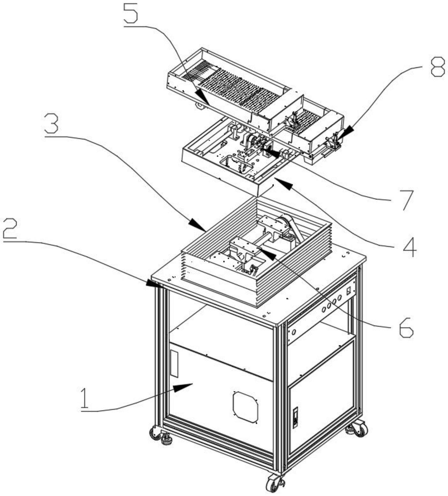 本实用新型公开了一种螺丝整列装置,包括:控制箱、支架、底板、连板和放置板,所述支架内部固定安装有控制箱,所述支架表面固定安装有底板,相对于传统的螺丝整列装置,本设备在使用时可以快速的对内部的螺丝进行定位和整理,通过来回往复的摆动放置板,使得物料能够精确的进入电镀盘内部的凹槽中,且后续可以对放置板整体的角度进行变动,使得整体的物料的整列更加准确,从而大大的提高了整体的工作效率,保证了设备自身的工作质量,还可以快速的对整体的物料盘进行定位,且可以同时对多组物料盘进行加工,使得后续放置板整体摆动、抖动时,内部的物料盘能够稳定的存放在存放仓内部,使得设备自身的使用更加稳定。