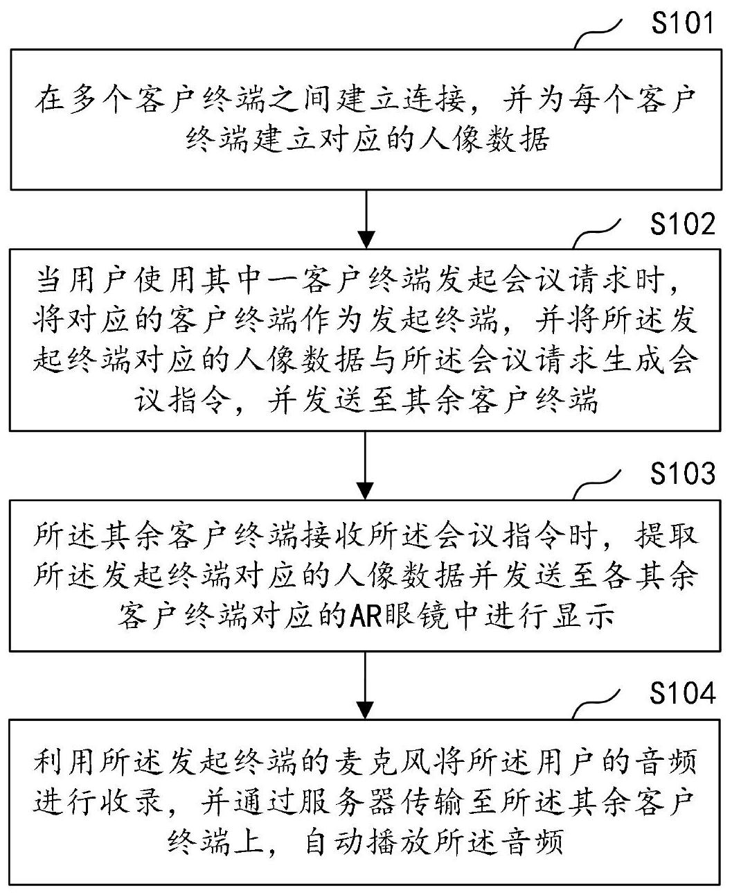 本发明公开了一种自组织会议通信方法、系统及其相关组件,其方法包括:在多个客户终端之间建立连接,并为每个客户终端建立对应的人像数据;当用户使用其中一客户终端发起会议请求时,将对应的客户终端作为发起终端,并将发起终端对应的人像数据与会议请求生成会议指令,并发送至其余客户终端;其余客户终端接收会议指令时,提取发起终端对应的人像数据并发送至各其余客户终端对应的AR眼镜中进行显示;利用发起终端的麦克风将用户的音频进行收录,并通过服务器传输至其余客户终端上,自动播放音频。本发明通过在多个客户终端建立连接,使用AR眼镜与麦克风进行实时会议通信,无需考虑外部5G基站是否充足的问题,会议通信更加方便快捷,且更加高效。