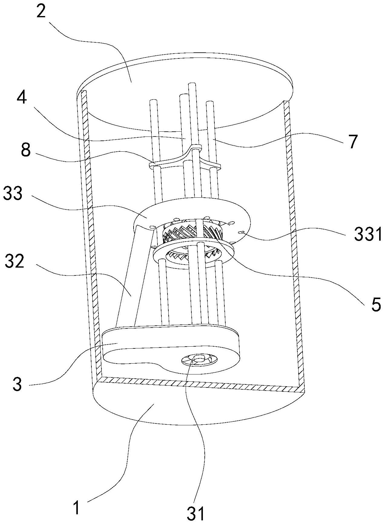 本实用新型涉及浆液乳化技术领域,特别是涉及浆液乳化机,包括设有端盖的桶体,桶体内设有与桶体的底壁上下间隔布置的泵壳,泵壳的内腔中设有叶轮,泵壳的下端设有与内腔连通的进液口,泵壳的上端设有与内腔连通的出液口;盖板的中部转动连接有竖直向下延伸的转轴,转轴的中部外侧固定有乳化头,转轴的下端与叶轮止转连接,出液口连接有管体,管体远离出液口的一端延伸至乳化头的上方;盖板的上端设有电机,电机驱动转轴带动叶轮和乳化头转动,将桶体底部的浆液抽送至管体的出液端,桶体内的浆液能够反复上下循环,受到乳化头的搅拌作用;本实用新型的浆液乳化机,仅用一个电机即可实现乳化头的转动和浆液的循环,结构简单、成本较低。
