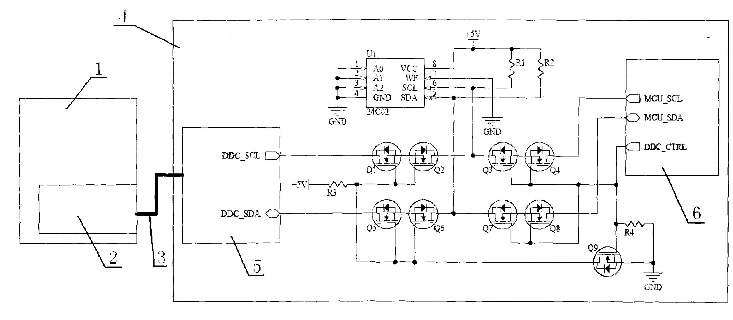 本发明涉及一种视频信号接口电路,本发明公开了一种DDC接口隔离保护电路,在视频信号输入接口上的DDC接口与视频信号接收设备E-EDID信息存储体的I2C接口之间的每条信号线上,连接有双向隔离器,该双向隔离器连接有上拉电阻,所述视频信号接收设备E-EDID信息存储体连接有上拉电阻;在视频信号接收设备E-EDID信息存储体的I2C接口与视频信号接收设备本地控制核心的I2C接口之间的每条信号线上,连接有双向隔离器,所述视频信号接收设备本地控制核心连接有下拉电阻和场效应管。本发明增加了保护电路,确保各部分电路之间,在电气特性上、数据读写操作上不会有冲突,防止丢失数据,便于维修。