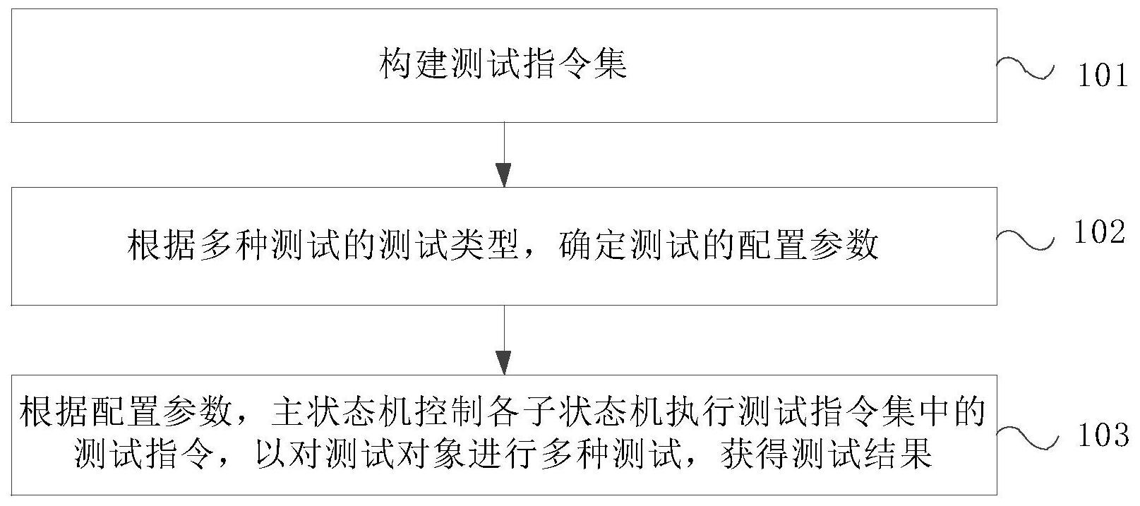 本申请提供一种测试方法、装置、电子设备及存储介质,该方法包括:构建测试指令集;其中,测试指令集包括用于对测试对象进行多种测试的多个测试指令,测试指令集中任意两个测试指令均不相同;多种测试中的任意一种测试需要通过执行测试指令集中的一个或多个测试指令实现;根据多种测试的测试类型,确定测试的配置参数;根据确定的测试的配置参数,由主状态机控制各子状态机执行测试指令集中的测试指令,以对测试对象进行多种测试,获得测试结果;解决了现有技术中的测试方法所获得的测试结果中含有重复的故障信息的技术问题,提高了测试结果的精确度,进而提高了故障修复效率。