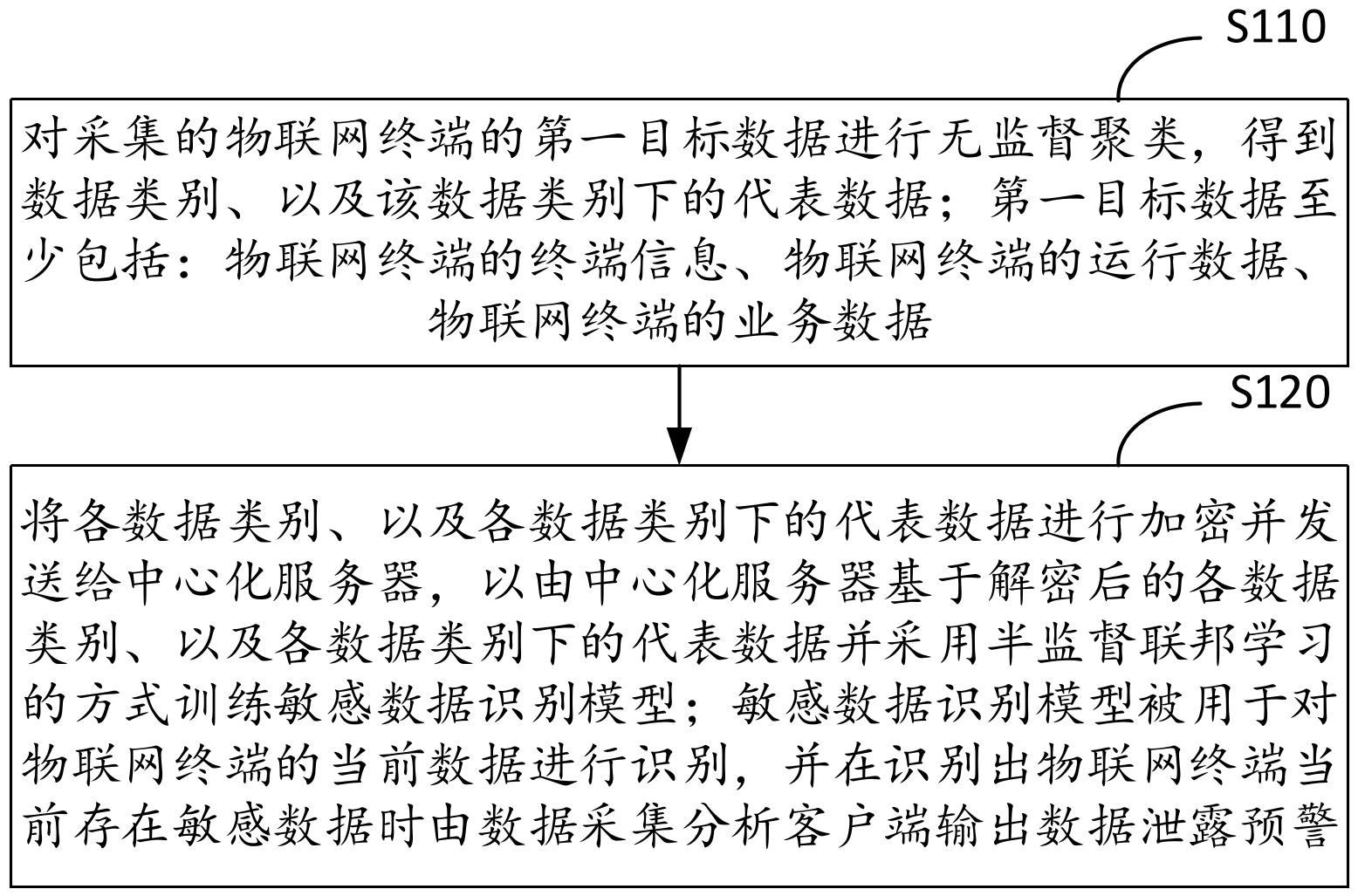 本申请实施例提供基于半监督联邦学习的数据泄露预警方法、装置及系统。在本实施例中,通过对采集的物联网终端的第一目标数据进行无监督聚类后的数据类别、以及该数据类别下的代表数据作为模型训练数据训练出敏感数据识别模型,不需要各个客户端自己训练模型得到的模型参数,可以避免攻击者恶意放置的设备训练的错误模型参数的影响,提高模型训练精度,进而提高数据泄露预测准确度;同时不同数据采集分析客户端采集的物联网终端的第一目标数据不同,因此利用聚类后的各物联网终端的第一目标数据训练出的敏感数据识别模型可以适配大规模异构物联网终端的多样化数据类型泄露检测。