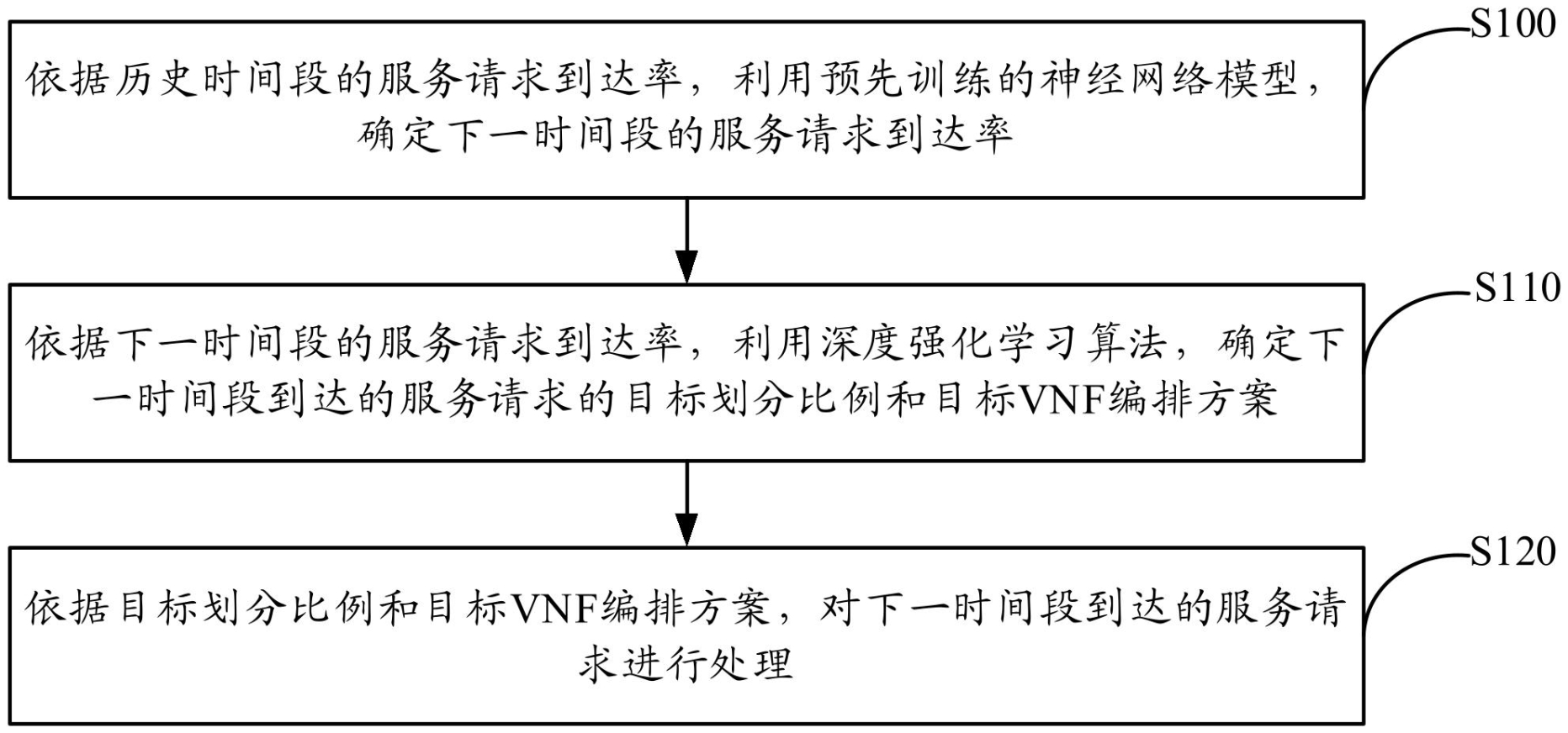 本申请提供一种基于双智能体深度强化学习的物联网服务编排方法及装置,该方法包括:依据历史时间段的服务请求到达率,利用预先训练的神经网络模型,确定下一时间段的服务请求到达率;依据所述下一时间段的服务请求到达率,利用深度强化学习算法,确定下一时间段到达的服务请求的目标划分比例和目标VNF编排方案;依据所述目标划分比例和目标VNF编排方案,对下一时间段到达的服务请求进行处理。该方法可以实现物联网环境下的服务请求的合理分配,降低物联网环境下的服务请求的计算成本。