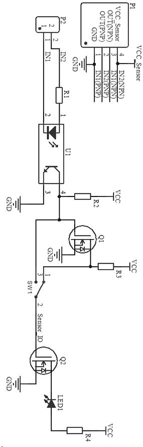 本发明公开了一种灵活适配传感器的接口电路及其应用,外部传感器依次与上板连接器、底板连接器、信号检测电路、开关选择和指示灯指示连接,外部传感器为NPN型常开/常闭传感器或PNP型常开/常闭传感器,上板连接器用于选择传感器的种类是NPN传感器还是PNP传感器,信号检测电路由电阻、光耦元件构成,用于检测传感器信号,开关选择为单刀双掷开关,用于选择传感器类型为常开或常闭,指示灯指示由MOS管、电阻和LED灯构成,用于显示传感器的工作状态,本发明结构简单,设计巧妙,节省了处理器I/O端口,减少了软件程序设计,降低了电路成本,抗干扰能力强,检测效果直观显示,调试方便,工作效率高,电路功能性强,操作灵活便捷,适用范围广。