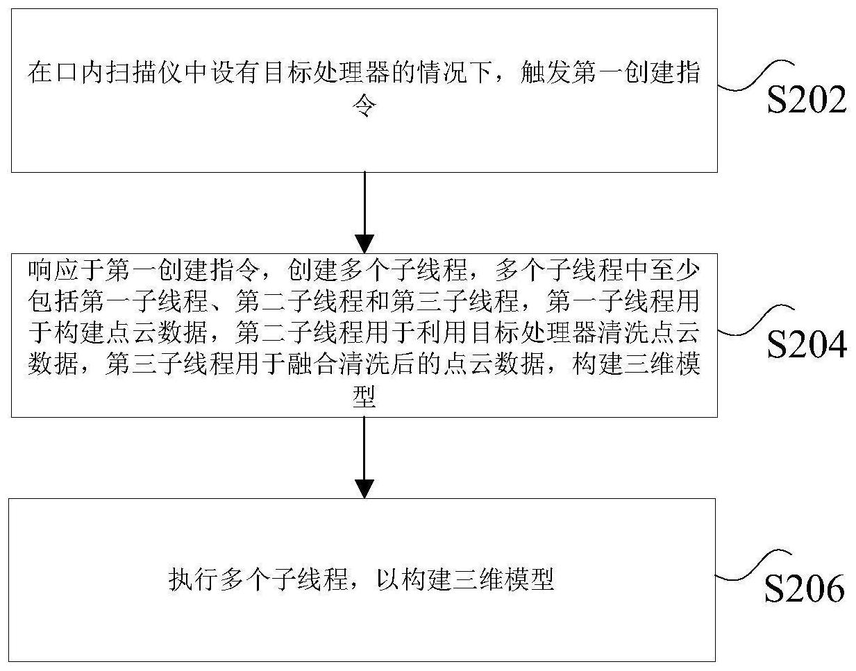 本申请公开了一种三维模型构建方法及装置、口内扫描仪。其中,该方法包括:在口内扫描仪中设有目标处理器的情况下,触发第一创建指令;响应于第一创建指令,创建多个子线程,多个子线程中至少包括第一子线程、第二子线程和第三子线程,第一子线程用于构建点云数据,第二子线程用于利用目标处理器清洗点云数据,第三子线程用于融合清洗后的点云数据,构建三维模型;依次执行多个子线程,以构建三维模型。本申请解决了口内扫描仪扫描效率低的技术问题。
