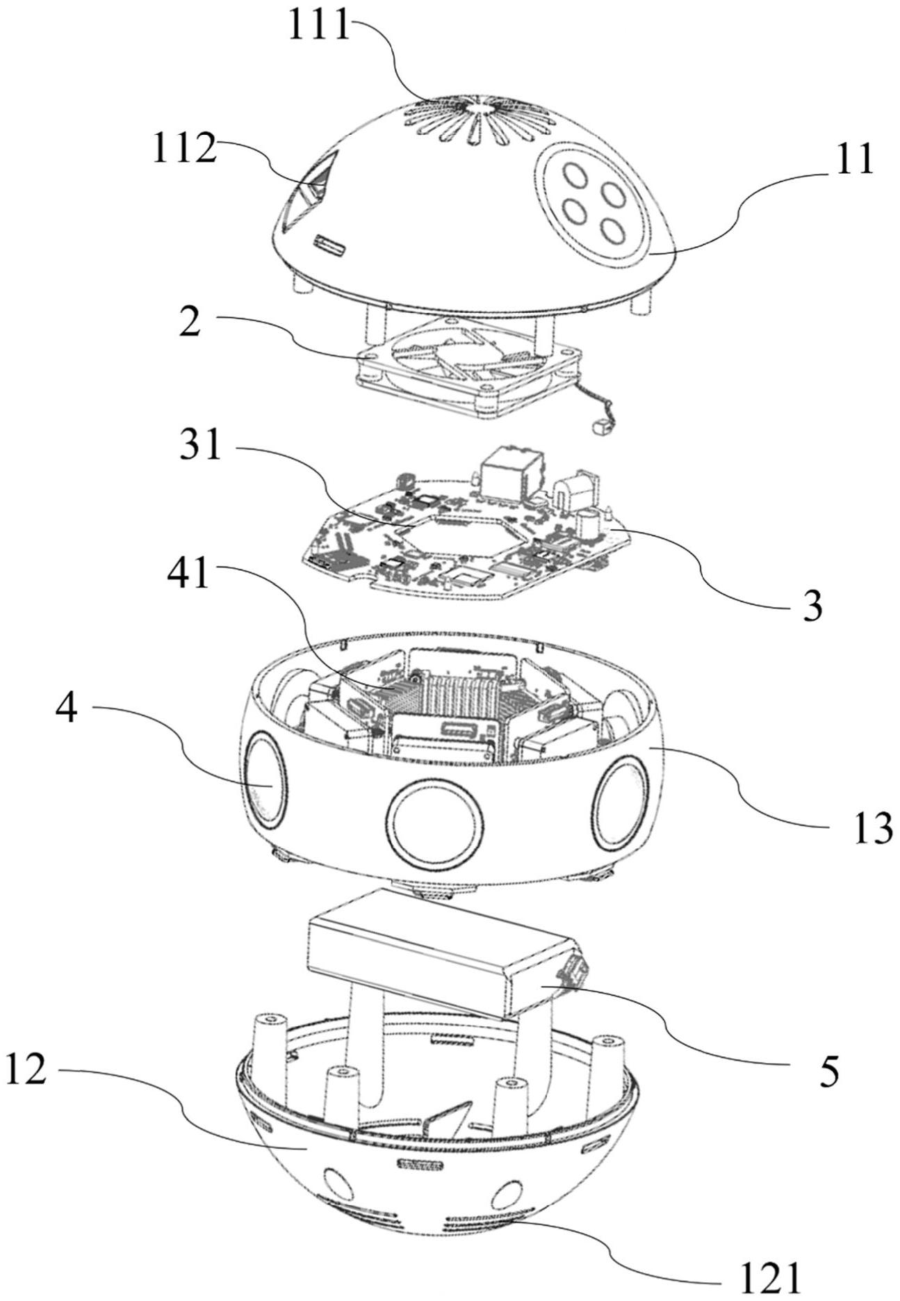本公开涉及光学相机设备技术领域,提供了一种全景相机。该全景相机包括外壳和设置于外壳的内部的主板、气流驱动装置和多个相机;将多个相机沿外壳圆周分布,每个相机靠近外壳中心的一侧均设有散热件,使多个散热件围成散热通道,将主板设置在多个相机所在平面的一侧,主板上设有通气口,在外壳上设有进风口和出风口,气流驱动装置被配置为能够使气体从进风口进入并穿过散热通道和通气口而由出风口排出,最终使外壳外侧温度较低的气体用过散热通道而持续接触散热件而提升散热效率,气体从进风口穿过散热通道和通气口后又从出风口排出的过程中无阻碍结构,提升外壳内气体的流动效率,使全景相机中发热量较大的高清相机保持正常工作。