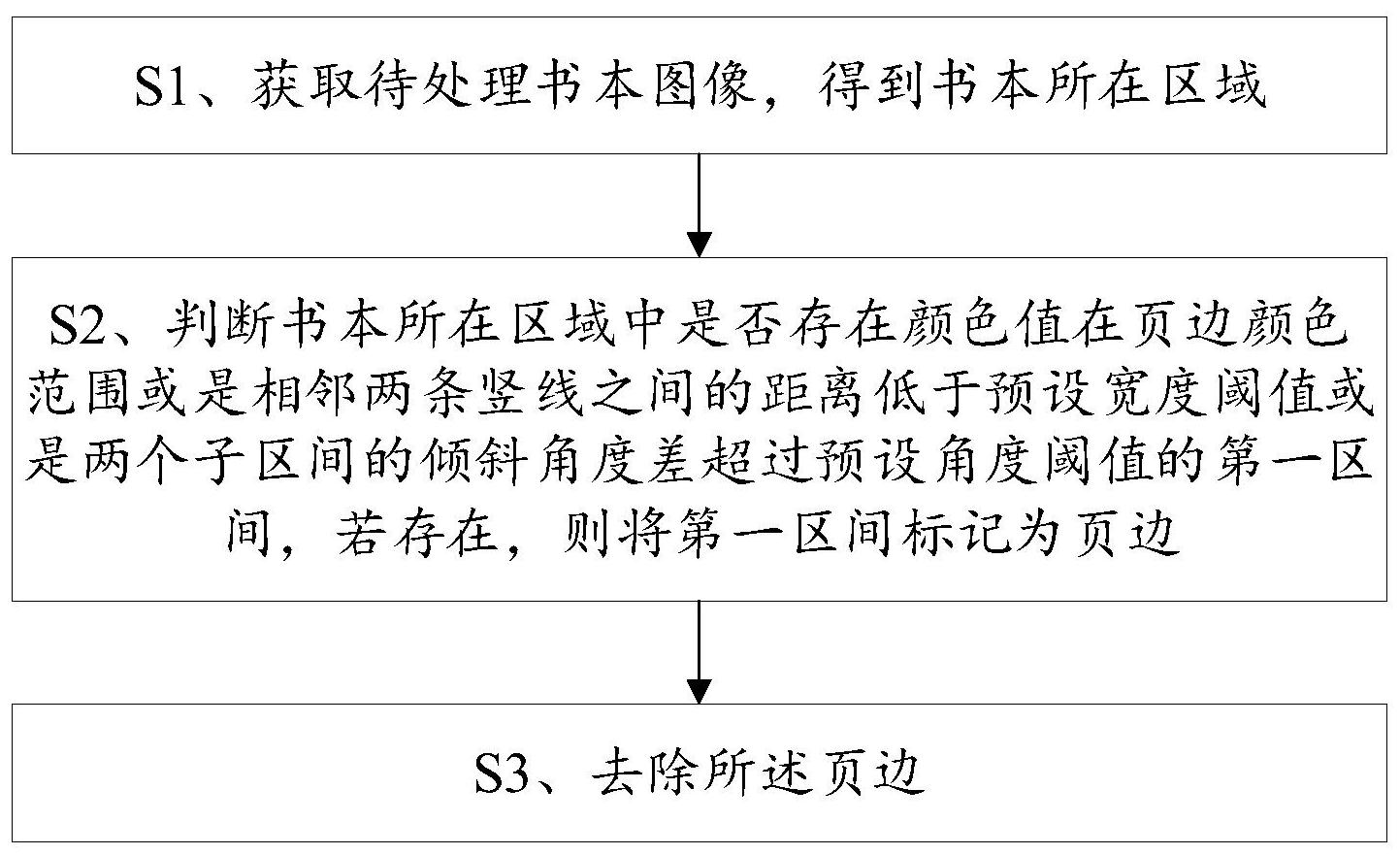 本发明公开了一种图片去页边的方法及终端,获取待处理书本图像,得到书本所在区域;判断书本所在区域中是否存在颜色值在页边颜色范围或是相邻两条竖线之间的距离低于预设宽度阈值或是两个子区间的倾斜角度差超过预设角度阈值的第一区间,若存在,则将第一区间标记为页边;去除页边。本发明的通过上述三个判断条件,以对页边出现的现象进行了全面考虑,保证了页边去除的精确度。