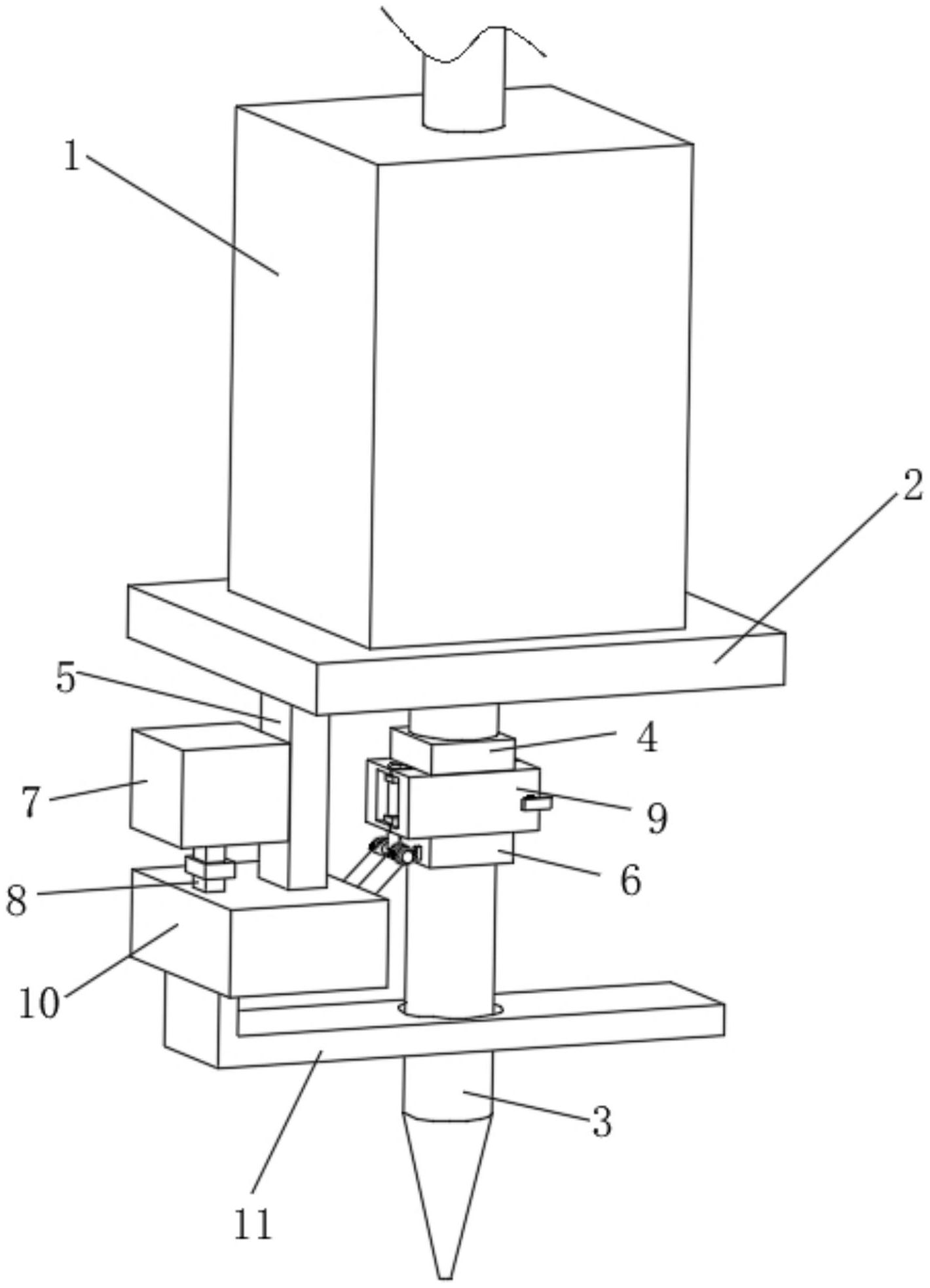 本实用新型公开了一种可降尘型液压破碎锤,包括外机壳,所述外机壳的下表面固定连接有安装板,所述外机壳的内壁滑动连接有破碎头,所述破碎头的底端贯穿安装板的下表面,所述破碎头的表面分别固定连接上定位板、下定位板,所述安装板的下表面固定连接有连接杆,所述连接杆的底端固定连接有压力箱,所述压力箱的上表面固定连接有入水钢管,所述入水钢管的表面固定连接有单向阀。本实用新型通过设置上定位板、下定位板,实现对固定降尘机构的固定稳定,通过设置入水钢管,实现对水箱的固定支撑,通过设置水箱,储存水源,通过设置固定降尘机构,使得破碎头运动通过固定降尘机构将压力箱内的水源通过喷雾板喷出,实现降尘的效果。
