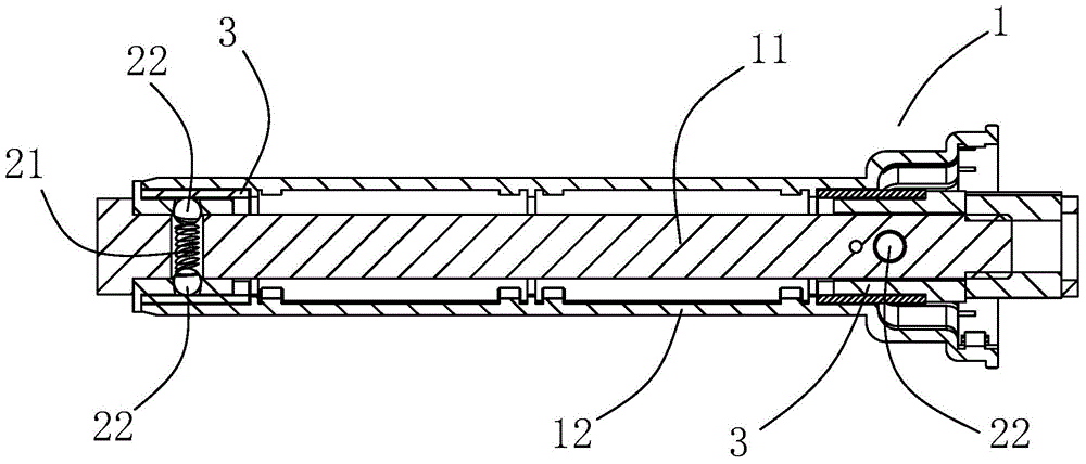 本实用新型提供一种气泡机的料轴阻尼结构,包括安装在气泡机主机架上的料轴,所述料轴用于安装带有塑料膜片的卷筒,所述料轴包括固定轴和套在固定轴上的外套管,所述外套管可相对于固定轴转动,所述阻尼结构包括沿径向穿设在固定轴上的压簧和压簧两端的顶珠,所述顶珠顶压在外套管的内壁上;所述顶珠可相对于压簧转动。本实用新型通过阻尼装置能够有限地限制释放塑料膜片的速度,避免因为料轴送料过多引起的设备故障和产品质量缺陷。