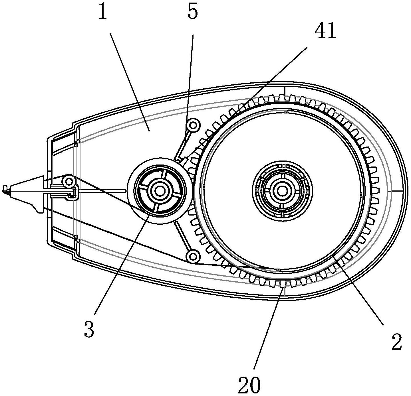 本实用新型公开了一种涂改带的逆止结构,包括有壳体、出带轮、收带轮,出带轮、收带轮均转动连接在壳体上,所述出带轮和收带轮均具有相互啮合连接的齿部,所述收带轮上紧套设置有逆止构件,逆止构件包括有摆动端,依靠逆止构件和收带轮之间的摩擦力,使得该逆止构件的摆动端能够在收带轮转动时被驱动摆动,所述壳体上设置有限位构件,该限位构件位于逆止构件的摆动端的一侧,能够在带芯正向输送时与逆止构件的摆动端配合进行限位,所述出带轮的齿部位于逆止构件的摆动端的另一侧,逆止构件的摆动端在带芯逆向输送时朝另一侧方向摆动并与出带轮的齿部配合以禁止出带轮朝带芯逆向输送的方向转动。本实用新型的涂改带的逆止结构不仅能够起到逆止的效果,而且使用时也更为静音。