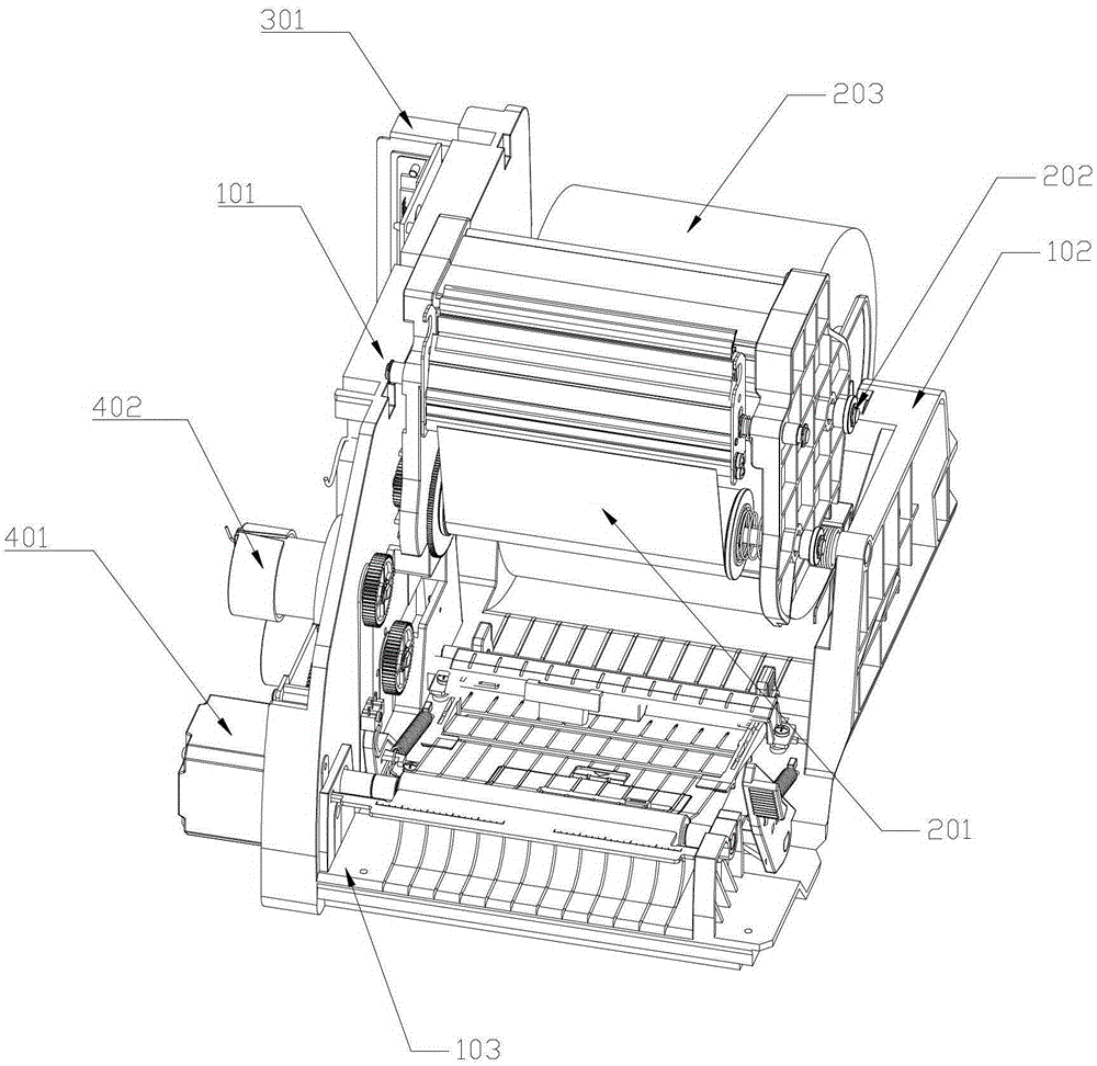本发明涉及一种一体式打印机机芯,用于紧密安装各打印机组件模块,包括底板、设置在底板两个相对侧边的第一侧板和第二侧板,第一侧板、第二侧板和底板一体成型。第一侧板和第二侧板上的相对位置上设置有卡口,用于将打印机组件模块固定在一体式打印机机芯上。实施本发明的一体式打印机机芯能够装配打印机所需的所有打印模组,使得打印机整体的体积减小,由于采用了一体成型的结构,降低了安装的误差,从而提高了打印的精度。