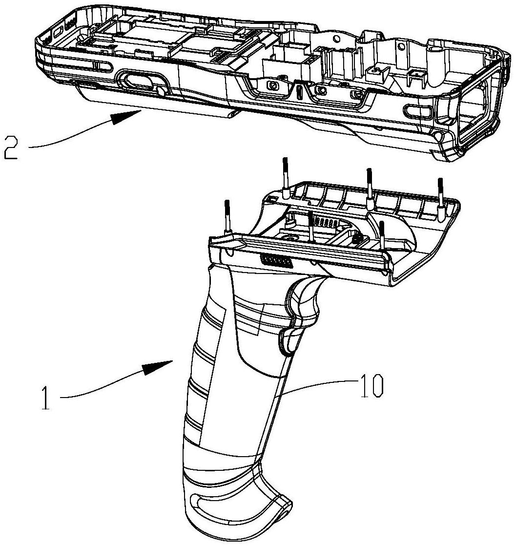 本实用新型公开了一种手柄及手持扫描设备,该手柄包括壳体、弹性件、扳机键、按键支架、按键、按键电路板、连接电路板和连接件;壳体用于与外部主机可拆卸连接;按键设于按键电路板上,按键电路板通过按键支架固定在壳体内部;扳机键和弹性件设于壳体上,且弹性件位于扳机键和按键之间,并对扳机键施加弹力;连接电路板固定在按键支架上并与按键电路板相连接;连接件设于连接电路板上并凸出于壳体顶部,用于与外部主机相连接。本实用新型将手柄作为一个拓展模块,并提供日常频繁使用的按键,可拆卸安装在外部主机上,即可使主机具备舒适的握取手感,灵活方便,更大程度提高灵活性和舒适性。