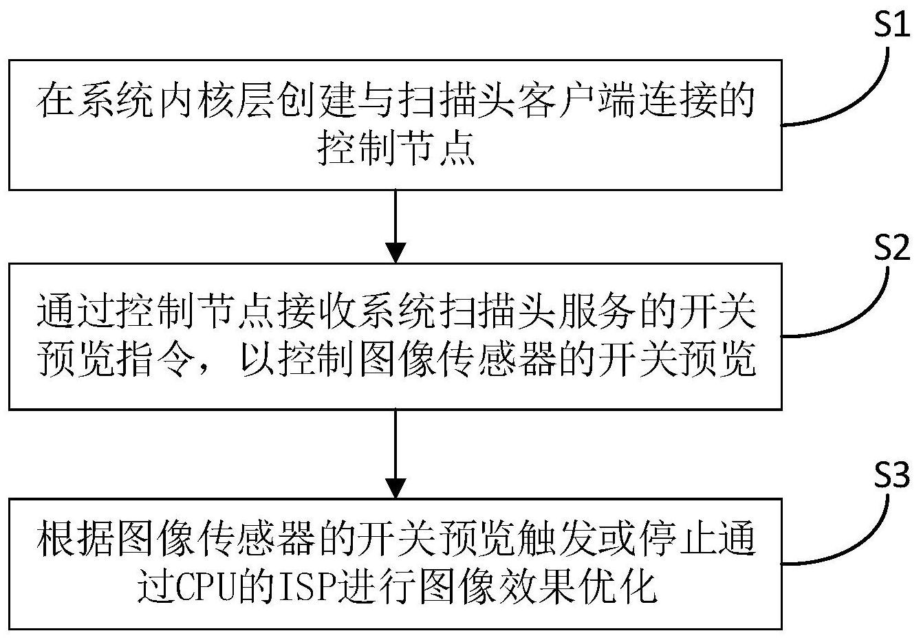 本发明公开了一种扫描头的控制方法及系统,该方法包括以下步骤:S1:在系统内核层创建与扫描头客户端连接的控制节点;S2:通过控制节点接收系统扫描头服务的开关预览指令,以控制图像传感器的开关预览;S3:根据图像传感器的开关预览触发或停止通过CPU的ISP进行图像效果优化。通过实施本发明,让系统扫描头服务不经过平台的层层架构就可以直接控制图像传感器的开关预览,缩短开启停止预览的时间,从而达到每次按下按键开启预览获取数据解码,松开按键便立即关闭预览的速度要求,加快了扫描速度,达到和带ISP的图像传感器进行开停预览一样的速度,同时因为每次松开按键就停止图像传感器预览,从而节省功耗。