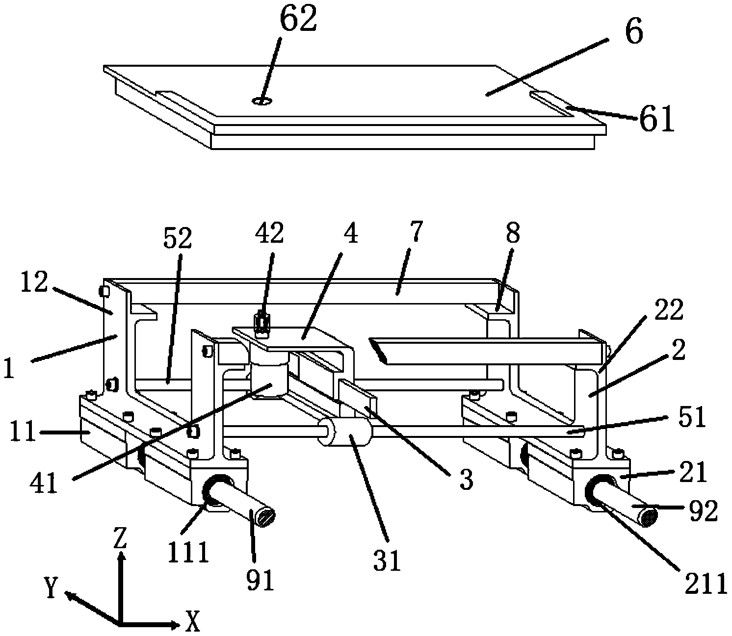 本实用新型公开了一种色带架装配平台及色带架输送机构,该色带架装配平台包括镜像设置的第一支撑座和第二支撑座、滑动机构以及驱动元件;所述滑动机构包括滑动部件、滑块和电机支架,所述滑动部件固定在所述第一支撑座和所述第二支撑座之间,所述滑块沿X轴方向滑动设置在所述滑动部件上,所述电机支架沿Y轴方向滑动设置在所述滑块上,所述驱动元件设置在所述电机支架上,且所述驱动元件的输出端设置有竖直向上的收带批头;所述收带批头的位置可以在所述第一支撑座和所述第二支撑座之间进行二维调节,从而可以匹配不同的装配模板,对不同款式的色带架进行收带处理,具有很好的通用性。