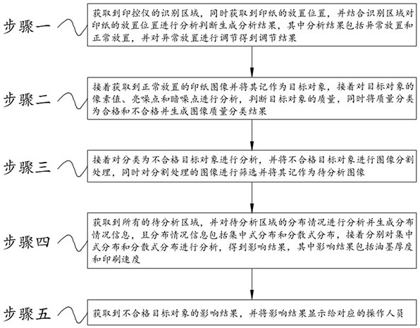 本发明公开了一种印控仪图像校准方法,本发明涉及图像校准技术领域,解决了印纸放置的位置存在偏差,不能合理的对参数进行调节,对图像整体质量造成影响的技术问题,本发明通过对印纸的放置位置进行识别分析,并根据识别的结果来对其进行合理的调整,从而能够减小后续位置的偏差带来的影响,其次针对图像质量进行分析,并根据图像的像素值、噪点数量来判断图像质量是否达到标准,并对没有达到标准的图像进行分析,通过分析油墨厚度和曝光时长来进行的确定具体的原因,针对具体的原因来进行合理的调整。