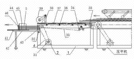 本实用新型公开了一种自动集纸堆叠收纸装置,其与压平机输出端相衔接,压平机输出瓦楞纸板进入到该自动集纸堆叠收纸装置的输入端,该装置包含集纸机架,设置在集纸机架上:电机及输纸部件,电机带动输纸部件运动;接纸部件;接纸部件包含:固定杆;接纸板,其水平铺设在固定杆上,且与输纸部件输出端相衔接;分别垂直设置在接纸板周边的前挡纸板、后挡纸板及一对侧挡纸板,前挡纸板位于输纸部件输出端底部;收纸下降光电,其安装在后挡纸板上,并与电机相连控制电机的启停。该装置可以将瓦楞纸板在接纸板上进行整齐的堆叠,操作人员只需直接拿走成叠瓦楞纸堆放,不需重复手动接纸并落纸收齐,大大降低了操作者的劳动强度,节省操作者操作时间。