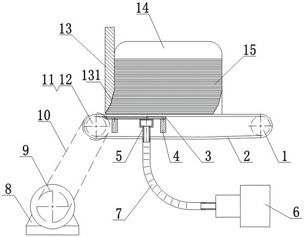 本实用新型公开了一种全自动覆面机底纸输送系统,包含:皮带被动辊、输送皮带、吸风斗、吸风斗固定距、吸风室、旋涡气泵、吸风管、底纸电机、电机链轮、链条、皮带主动辊、主动辊链轮、底纸前挡规、底纸侧挡规,还包含:吸风室,所述的吸风室与吸风管相连;吸风斗,所述的吸风斗与吸风室相连通,并将纸堆最下面的纸吸附在输送皮带上;吸风斗固定距,所述的吸风斗固定距固定吸风斗,使所述的吸风斗紧贴输送皮带。本实用新型通过改进吸风斗及前挡规结构,不仅满足瓦楞底纸的输送,而且还可以满足底纸为卡纸的吸风输送,提高了全自动覆面机的适应性。