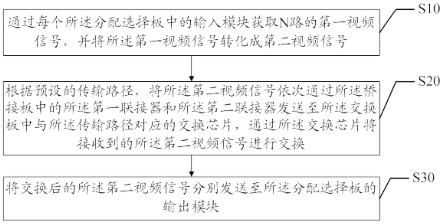 本发明公开了一种信号传输方法、装置、设备及可读存储介质,该方法包括步骤:通过分配选择板中的输入模块获取N路的第一视频信号,并将第一视频信号转化成第二视频信号;根据预设的传输路径,将第二视频信号依次通过桥接板中的第一联接器和第二联接器发送至交换板中与传输路径对应的交换芯片,通过交换芯片将接收到的第二视频信号进行交换;将交换后的第二视频信号分别发送至分配选择板的输出模块,本发明可以通过多个规格较小的交换芯片分别处理从不同传输路径传递过来的视频信号,进一步的通过增加交换芯片的个数和传输路径的路数提高对视频信号的处理能力,满足超大规模视频矩阵的需要。