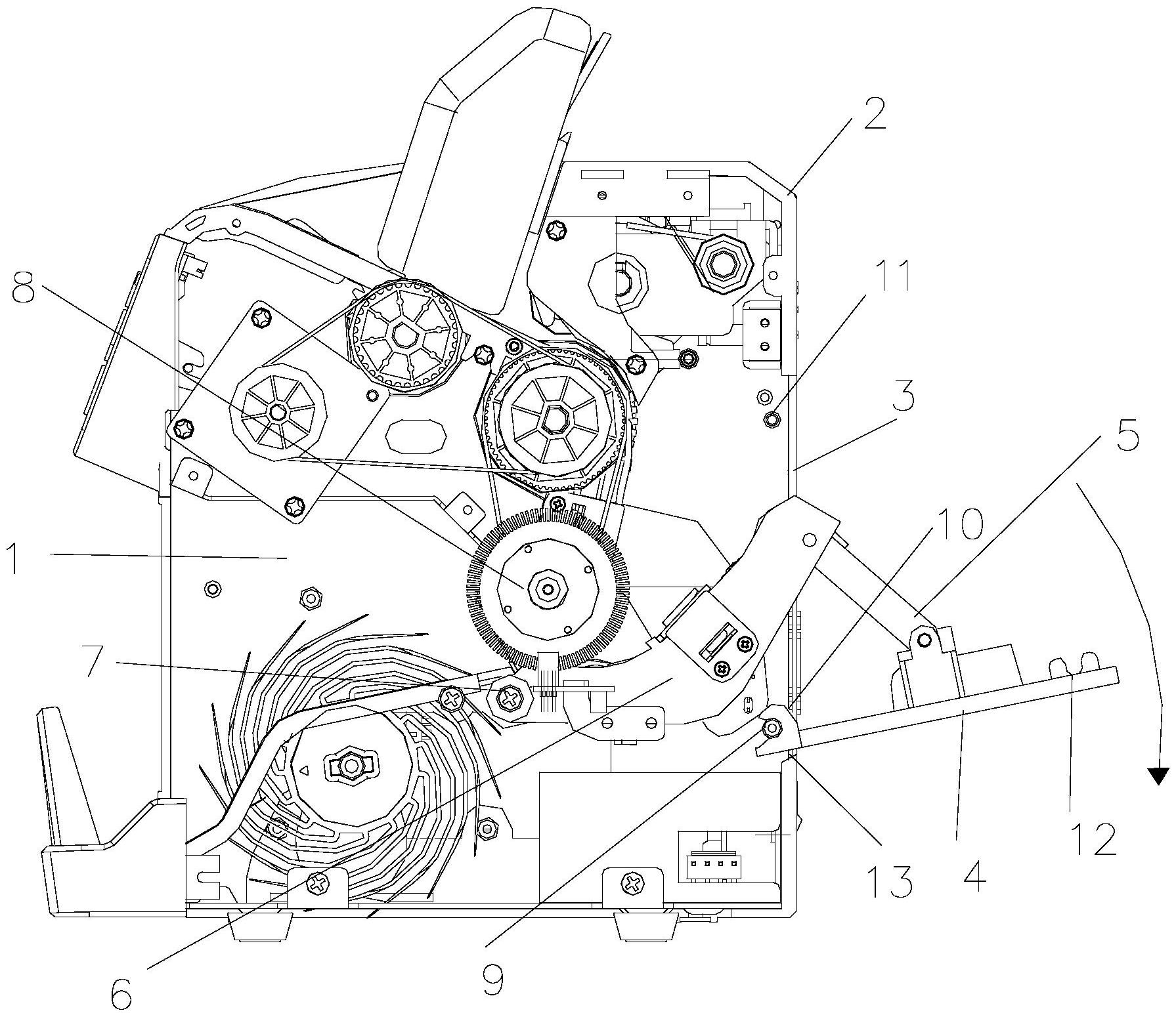 本实用新型涉及点钞机通道打开装置,点钞机的外壳背面设有用于打开的开孔,后盖通过内侧面下端可转动安装在开孔内,用于开合开孔,后盖内侧面上轴连接联动拉杆一端,联动拉杆另一端轴连接下通道板背面,下通道板下端通过与设置在外壳内壁上的下通道板转动支点连接,可转动的设置在点钞机的出钞轮后侧。优点为结构简单,容易安装,后盖打开时能够自动带动下通道板转动,后盖合上能够固定下通道板;方便打开外壳处理卡钞和清理灰尘。