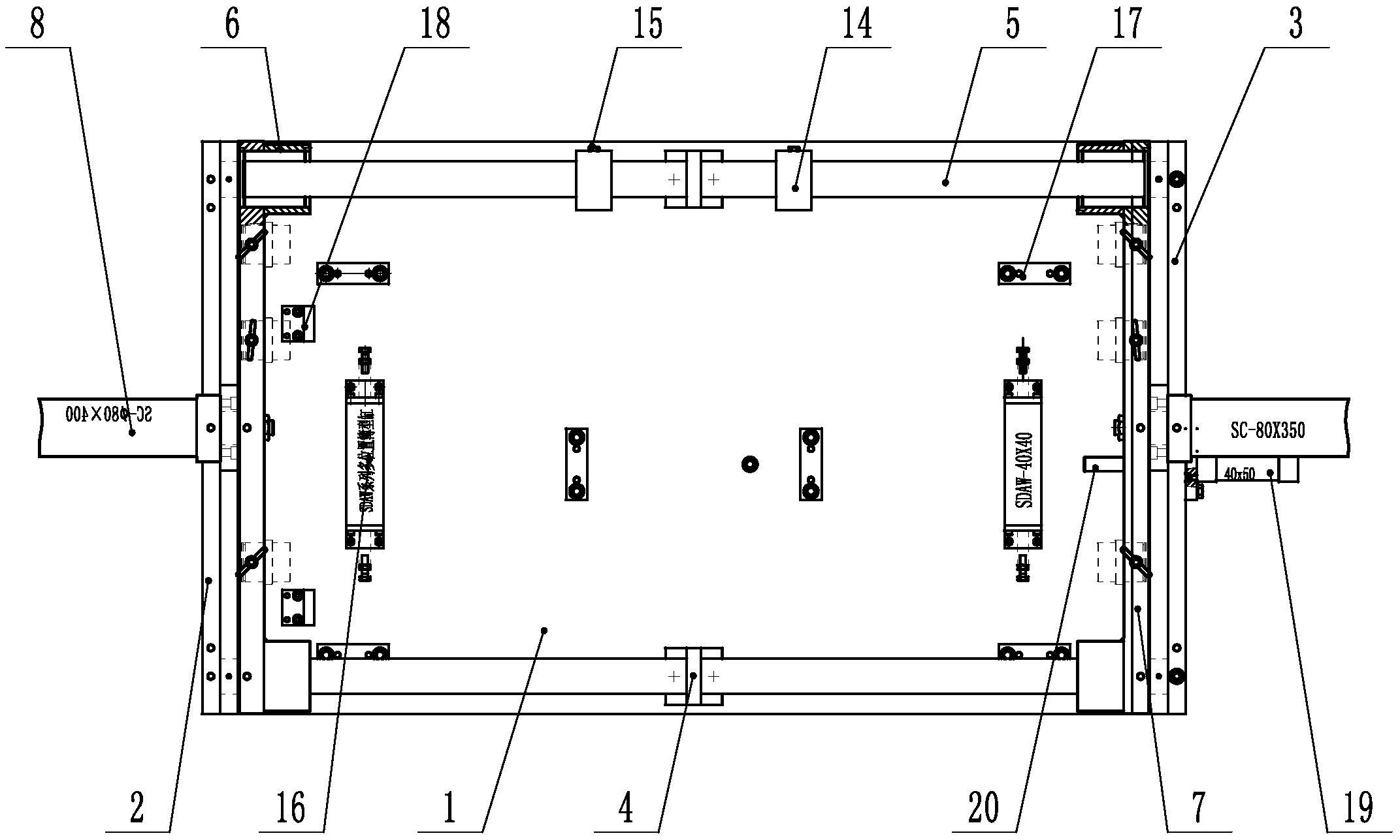 一种叉车滑架焊接夹具,包括底座,所述底座左固定座、右固定座,底座中间位置的上下两侧设有中定位座,左固定座与两个中定位座之间、右固定座与两个中定位座之间设有定位轴,定位轴上设有直线滚动轴承,同一侧的两个直线滚动轴承之间设有移动座,左固定座、右固定座上均设有第一气缸,第一气缸的活塞杆与与其相近的移动座相连接,能过推动移动座在定位轴上滑动,移动座上设有用于装夹定位滚轮轴的滚轮轴装夹装置;本实用新型具有结构简单、设计合理、能有效提高叉车滑架焊接精度与效率等优点。
