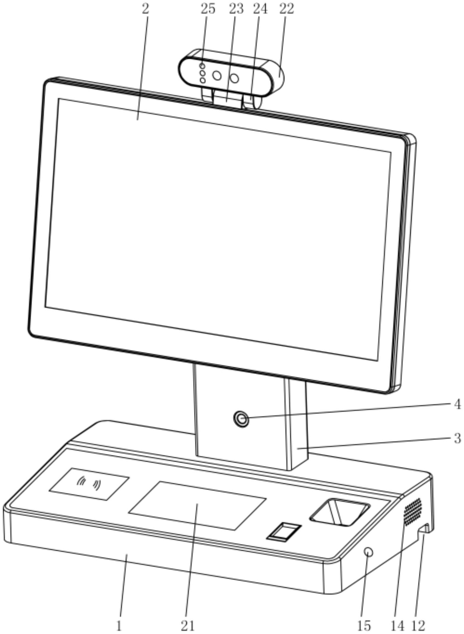 本实用新型涉及自助业务设备技术领域,具体指一种防伪业务终端;包括底座和显示器,所述底座上设有立柱,立柱的下端与底座固定连接,立柱的上端与显示器的背面固定连接从而使显示器设置在底座的上方;所述底座上设有信息采集模块,显示器的上端设有人脸识别模块,所述立柱的前侧设有场景摄像头,场景摄像头的取景范围可覆盖所述信息采集模块;所述立柱的后侧设有高拍仪,高拍仪与立柱配合连接;本实用新型结构合理,场景摄像头可以监控业务办理人员的整个业务办理过程,身份信息验证、指纹验真、签字动作均在场景摄像头中,保证合同签署的信息真实性,防止漏签、代签和替换等合同欺诈风险问题。