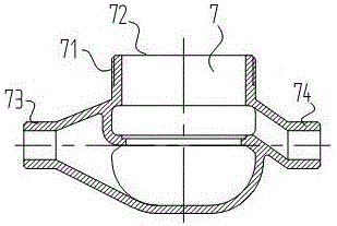 本实用新型属于机械加工工装技术领域,具体涉及一种水表壳体车夹具。所述水表壳体车夹具包括一个卡盘,卡盘内设置驱动机构,驱动机构驱动上卡爪和下卡爪向中心靠近或退出,上卡爪和下卡爪上分别设置与进水道和出水道的角度相适应的梅花顶尖,梅花顶尖均朝向水表壳体安装。该夹具使得水表壳体的定位和夹紧可以同时完成,所以水表壳体的定位夹紧效率高,另外梅花顶尖能方便的适应不同尺寸或公差的进水道和出水道,从而适应不同规格的水表壳体加工,并保证其加工精度。