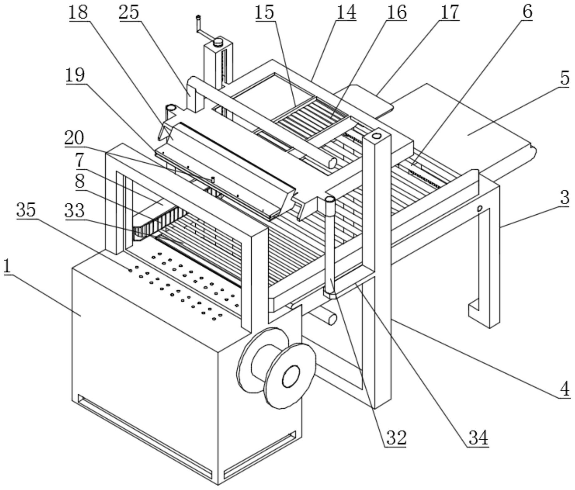 本发明公开了一种高效自动打捆机包装纸辅助固定装置,属于打捆机设备技术领域,一种高效自动打捆机包装纸辅助固定装置,包括打包机本体、搭接于打包机本体一侧的底支架以及固定安装于底支架中部两侧的侧支架,所述打包机本体顶面在靠近所述底支架一侧开设有安装槽,所述安装槽内部可拆卸安装有用于底部包装纸输送切割的底传输机构,所述底支架在远离所述打包机本体一端设置有置物平台,所述底支架顶面在靠近所述置物平台一端阵列转动连接有第一导向辊,且另一端阵列转动连接有第二导向辊;它可以实现在物品输送的同时,将包装纸放置在其顶底面,并根据需要的长度进行裁切,同时直接进行打包,使得包装纸位置放置准确,同时打包效率更高。