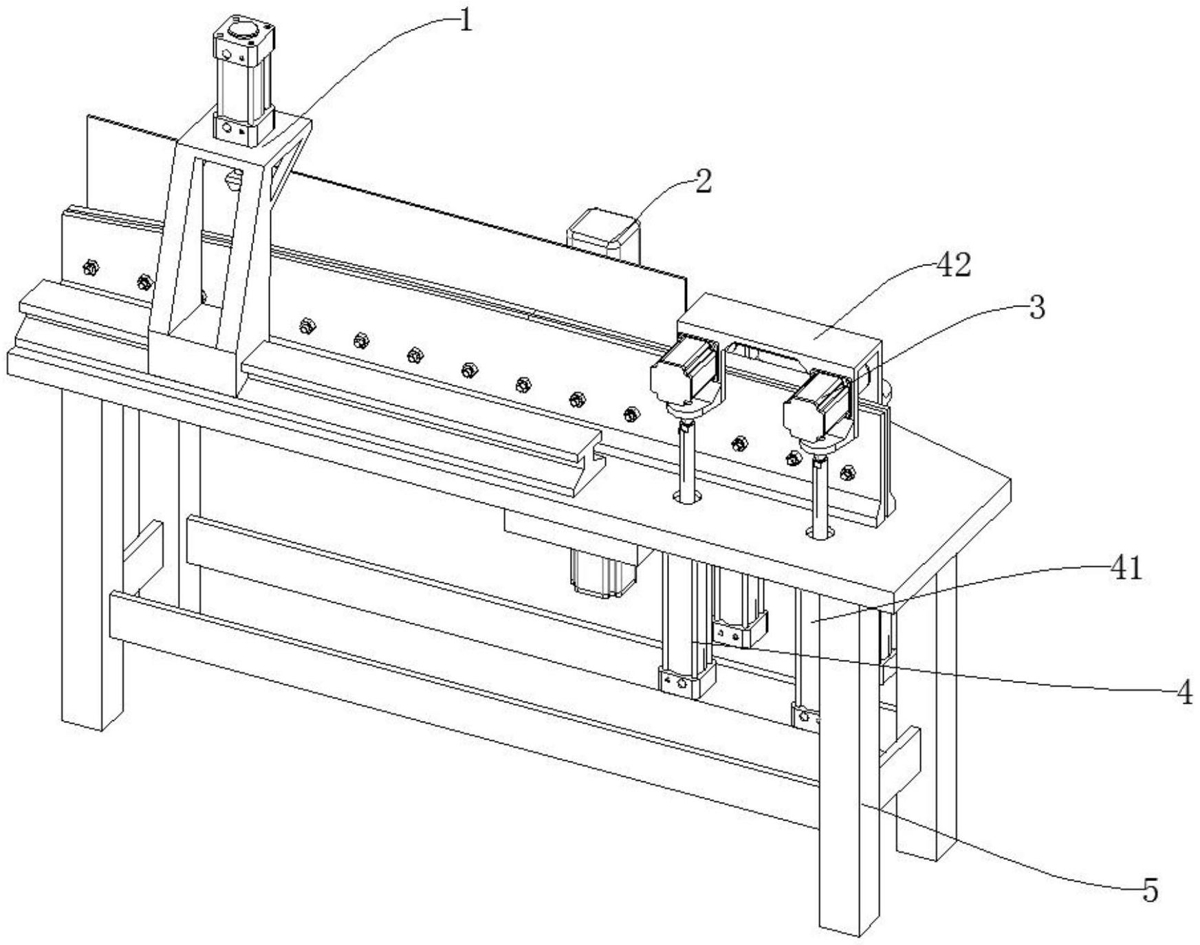 本实用新型公开了一种前框校直工装,包括用于对前框进行输送的输送机构、用于对所述输送机构进行升降的升降机构、机架、校直架,所述输送机构位于所述机架上方,所述升降机构位于所述机架下侧,所述校直架位于所述机架顶部且位于所述输送机构下侧。本实用新型利用调节电机转动部带动螺杆转动来调整调节架上升或者下降,从而通过调节架来将水平仪投射出来的水平光线照射到透光板上,从而来利用水平光线来快速的定位出前框的弯曲位置,利用移动架在移动轨道上的移动来带动挤压气缸和挤压座移动到前框弯曲位置,通过挤压气缸伸缩部推动挤压座向下挤压前框的弯曲位置,从而来将前框进行校直并提高前框的校直效率。
