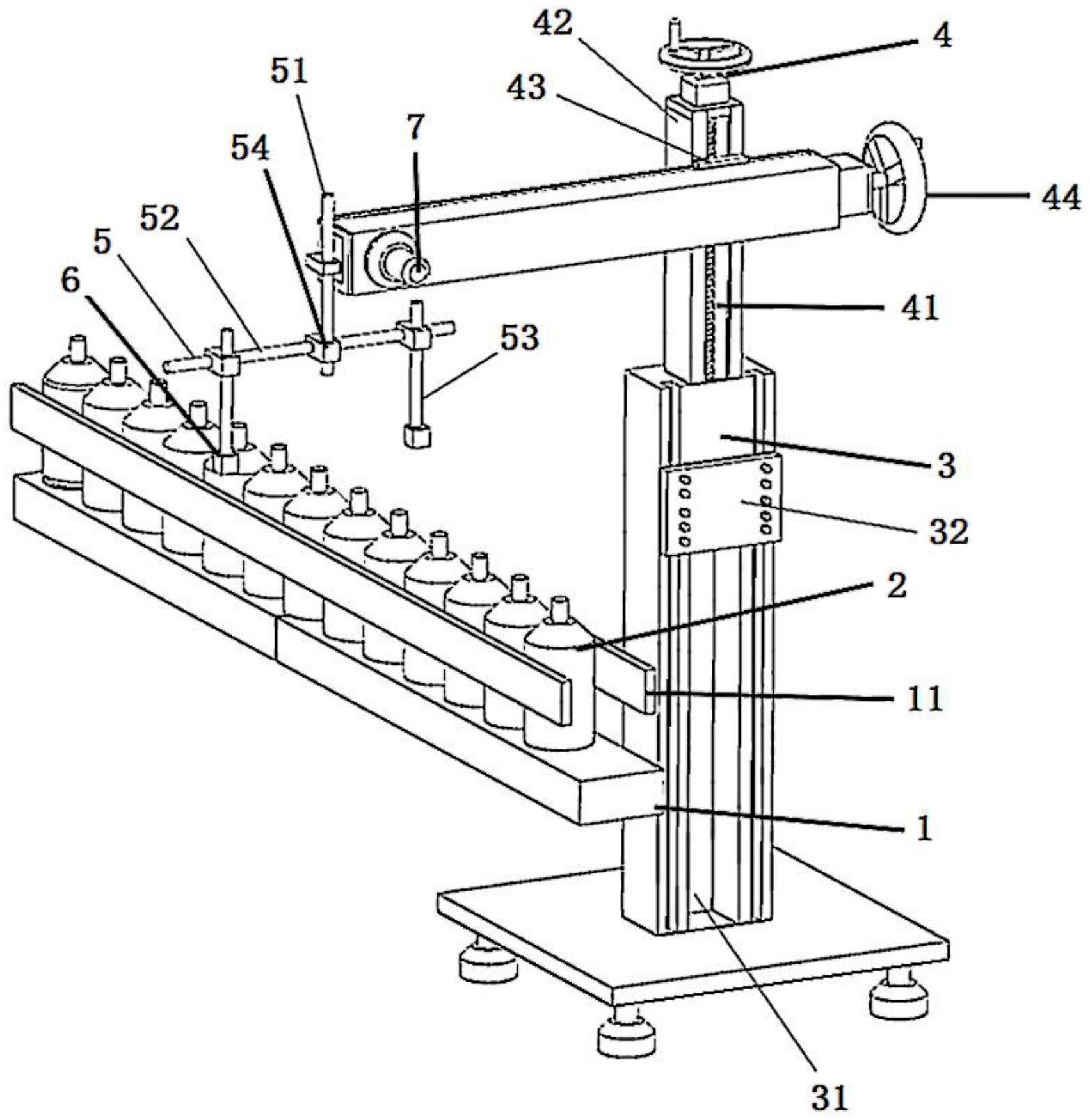 本实用新型公开了一种外盖压合质检辅助装置,涉及酒产品生产技术领域,设有支撑结构、连接架、对射传感器、继电器和报警器;支撑结构安装固定,对射传感器通过连接架安装固定至支撑结构上,其设置高度恰好高于合格的半成品酒顶部的高度,且其发射端和接收端分别位于半成品酒输送路径的两侧;继电器分别与对射传感器和报警器电性连通,且仅当对射传感器触发时,继电器接通报警器设有电源的回路。本实用新型利用瓶盖未压盖到位的不合格半成品酒与合格的半成品酒之间的高度差,以对射传感器对半成品酒顶部的高度进行检测,进而在半成品酒高度高于正常高度时通过报警器报警。