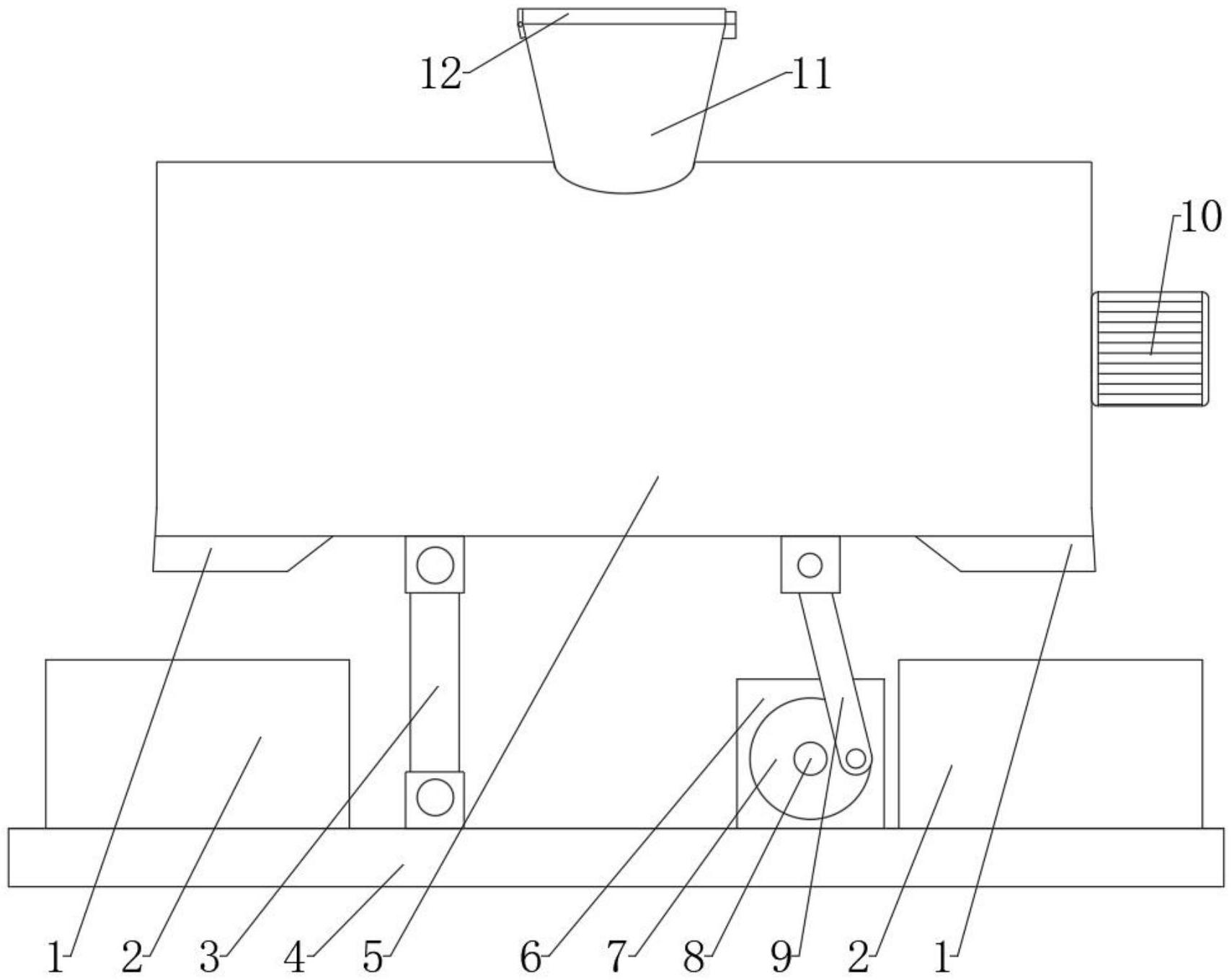 本实用新型涉及一种食品加工用粉碎筛分装置,包括底座和粉碎筒,底座上表面设有驱动机构,驱动机构通过曲柄连杆机构连接于粉碎筒,粉碎筒铰接有摆杆,摆杆铰接于底座上,粉碎筒内设有过滤网,过滤网将粉碎筒分隔成粉碎腔和过滤腔,过滤腔底部设有排料斗,粉碎腔内设有转轴,转轴上设有多个粉碎刀,转轴两端分别转动穿设于两侧的过滤网和粉碎筒侧壁上,转轴驱接有电机一。利用摆杆和曲柄连杆机构的配合带动粉碎筒在粉碎过程中左右摇摆,使得原料在粉碎筒内左右移动以增加原料间、原料与切割刀间的撞击概率,且在粉碎筒内设有过滤网,使得粉碎完成后的原料穿过过滤网从排料斗排出,实现在粉碎过程中不断被过滤,粉碎效率高,粉碎效果好。
