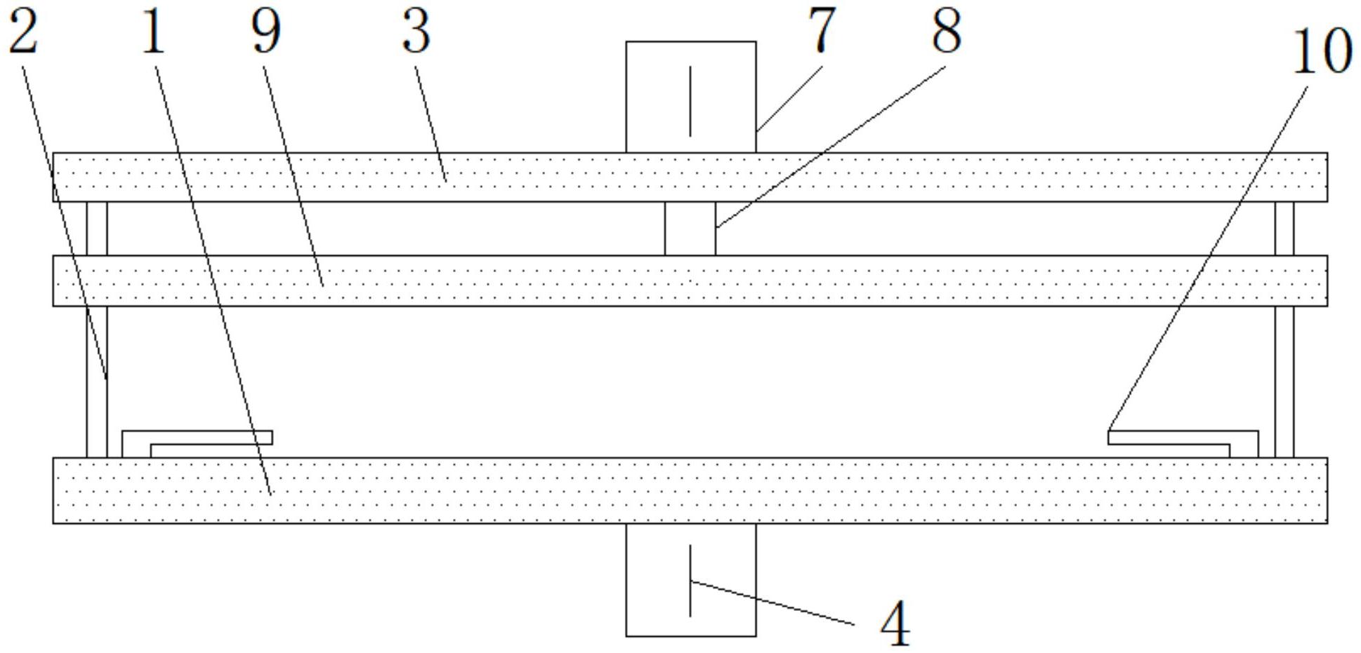 本实用新型公开了一种复合纸包装拼接覆膜设备,包括基台,所述基台的下表面中部位置固定连接有第一气缸,所述第一气缸的输出端贯穿至基台的内部固定连接有托板,所述托板上固定连接有电热板,所述基台的上表面中部位置固定设置有PE带放置槽,且托板相对位于PE带放置槽的内部,所述基台的上表面外侧固定设置有立杆,所述立杆的上端固定连接有横梁板,所述横梁板的板身上表面中部固定连接有第二气缸,所述第二气缸的输出端贯穿横梁板的板身连接有压板,且压板滑动设置在立杆的杆身上。本实用新型中,设置PE置放槽,在复合纸热压时,将PE带压合在两侧复合纸连接的内侧表面,保证复合纸纸层不裸漏,生产中接头进入双氧水浸泡灭菌时不会致使纸层涨开。