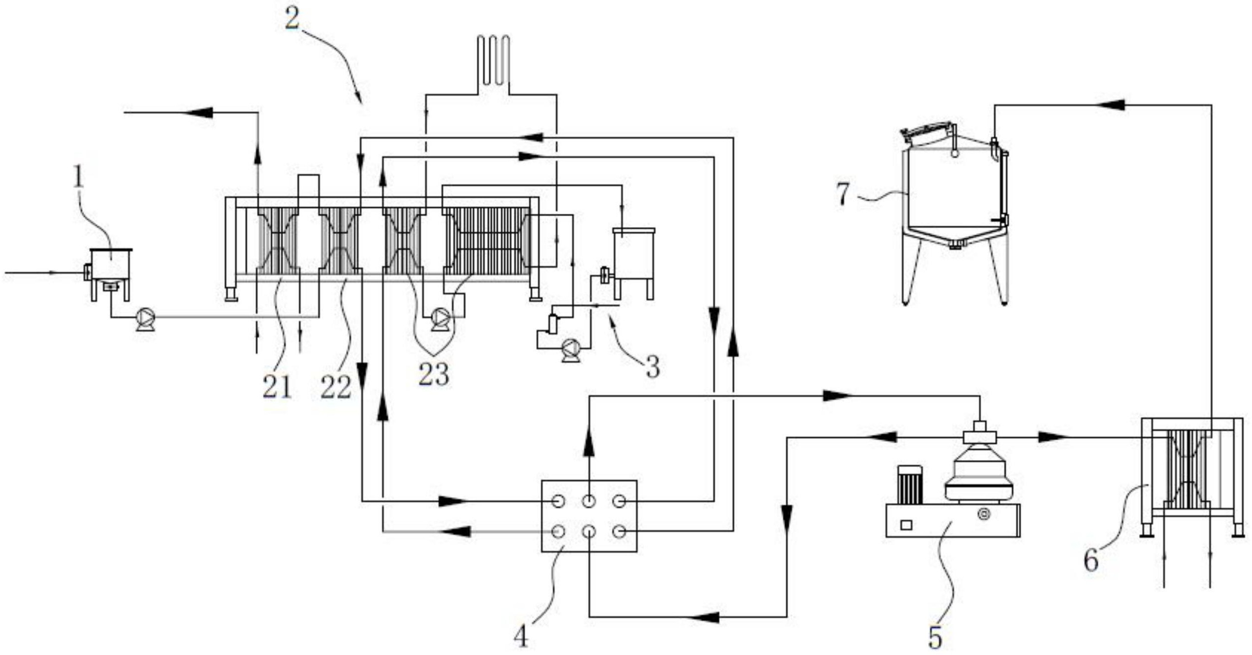 本申请涉及一种生鲜奶分离制备装置,涉及鲜奶加工技术领域,其包括杀菌机和乳脂分离机,杀菌机包括冷却单元、预热单元和杀菌单元,杀菌单元连接有蒸汽加热装置,杀菌机和乳脂分离机之间设有管道分配盘,管道分配盘具有至少六个管道接口,其中,一个管道接口连接预热单元生奶侧出口,一个管道接口连接杀菌单元生奶侧入口,一个管道接口连接杀菌单元熟奶侧出口,一个管道接口连接乳脂分离机入口,一个管道接口连接乳脂分离机脱脂奶出口,一个管道接口连接预热单元熟奶侧入口或冷却单元。本申请具有能够根据工艺流程实现杀菌后分离与杀菌前分离的切换的效果。