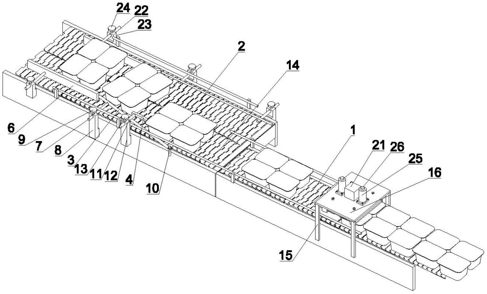 本实用新型涉及生产设备技术领域,具体为一种包装盒转向机构,包括首尾相邻的第一传动带和位于第一传动传送方向前方的第二传动带,第二传动带上部左侧设有前端向内倾斜的挡杆,挡杆的上部设有用于与联杯包装盒左前角处接触的挡件,挡件位于联杯包装盒左侧边缘与挡杆接触点处的内侧;接触点至第二传动带右侧边缘的距离大于联杯包装盒的长度;在第二传动带上方,挡杆的前端两侧均设有与联杯包装盒长度相匹配的限位挡板;利用传动带的传送以及挡杆、挡件的配合,使联杯包装盒与挡杆、挡件发生接触时,让联杯包装盒翻转转向,使联杯包装盒由宽度方向垂直于传送方向翻转为平行于传送方向,具有结构简单,翻转效果好,节省人工的特点,提高了工作效率。