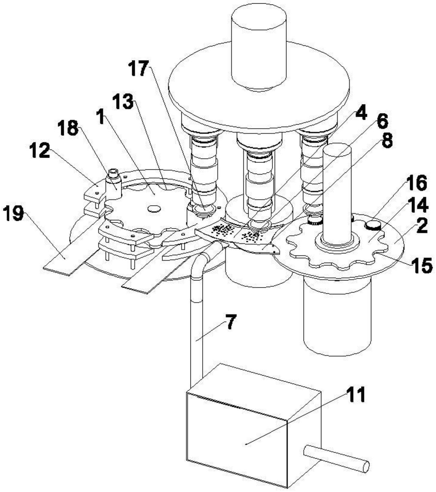 本实用新型涉及生产设备技术领域,具体为一种用于清除PET瓶盖盖屑的装置,包括设置在旋转架和分拨盘之间的圆弧形的轨道架,轨道架长度方向上的延伸形状与拧盖器旋转路径相匹配,底板与分拨盘的边缘齐平;轨道架包括底板以及位于底板底部的空腔;底板上设有与空腔连通的散布孔;空腔外侧连通有气管,气管连通有负压装置;1、通过负压装置产生空气吸力,将粘在拧盖器内和PET瓶盖内部的盖屑吸入吸尘箱内,避免拧盖器在为包装瓶旋盖时,盖屑落入包装瓶内,降低了产品质量隐患;2、直接将用于吸走盖屑的轨道架安装在旋转架和分拨盘之间即可,安装方便,不会对原有设备做出大改动,除屑效果显著。