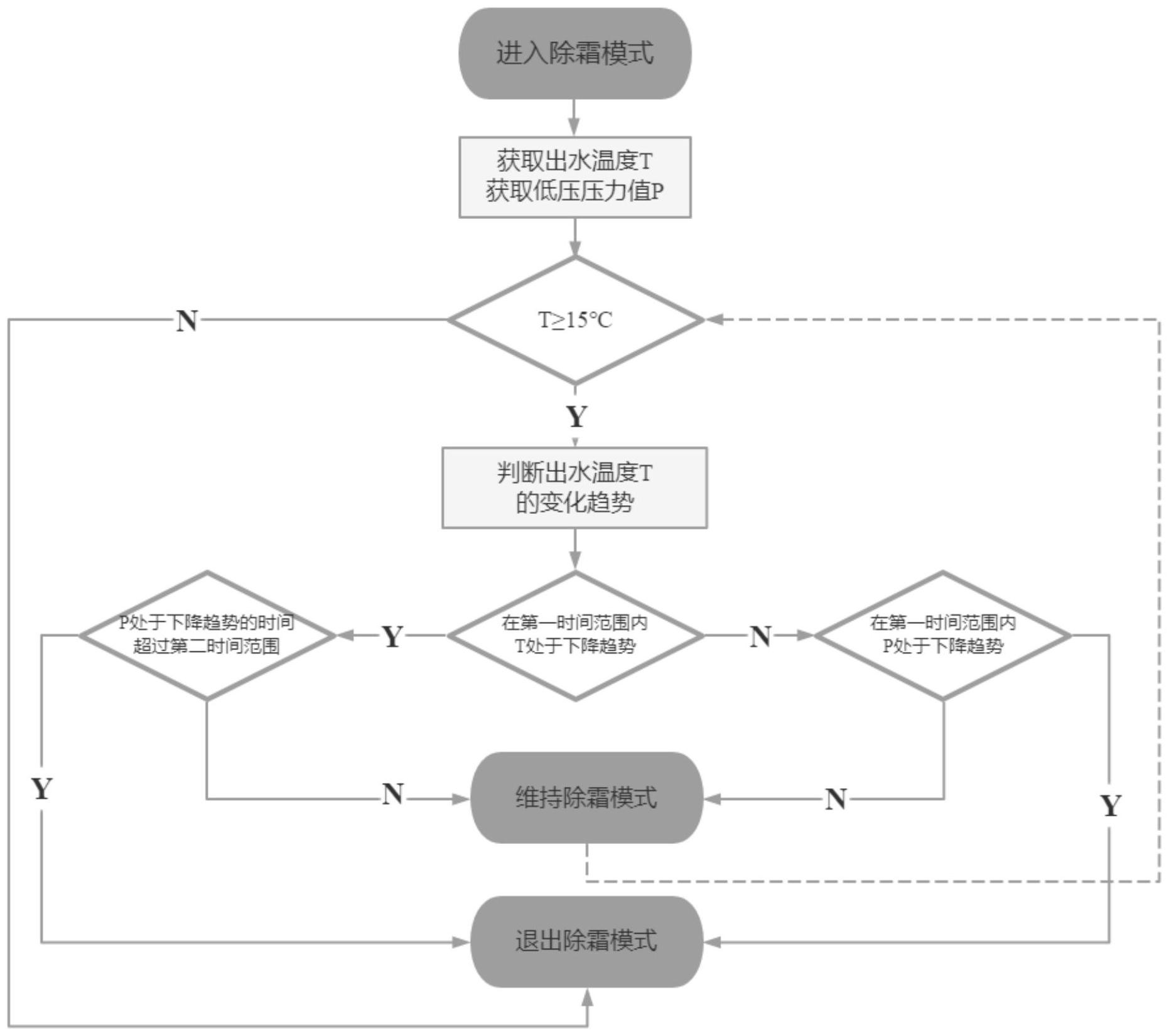本发明涉及一种防止热泵机组除霜时水流缺失导致失效的控制方法。本发明所述的热泵机组包括外壳,设置在外壳内的压缩机、四通阀、水侧换热器、空气侧换热器、出水温度传感器和低压压力传感器,以及连通压缩机、四通阀、水侧换热器和空气侧换热器的冷媒管路;出水温度传感器设置于水侧换热器的排水端,低压压力传感器设置于压缩机的回气端;方法包括如下步骤:进入除霜模式后,通过出水温度传感器获取出水温度,通过低压压力传感器获取低压压力值;若出水温度大于等于预设温度阈值,且在设定的第一时间范围内,出水温度未处于下降趋势,以及低压压力值处于下降趋势,则退出除霜模式。该法增强了机组运行的可靠性,提高除霜时机组的安全性。