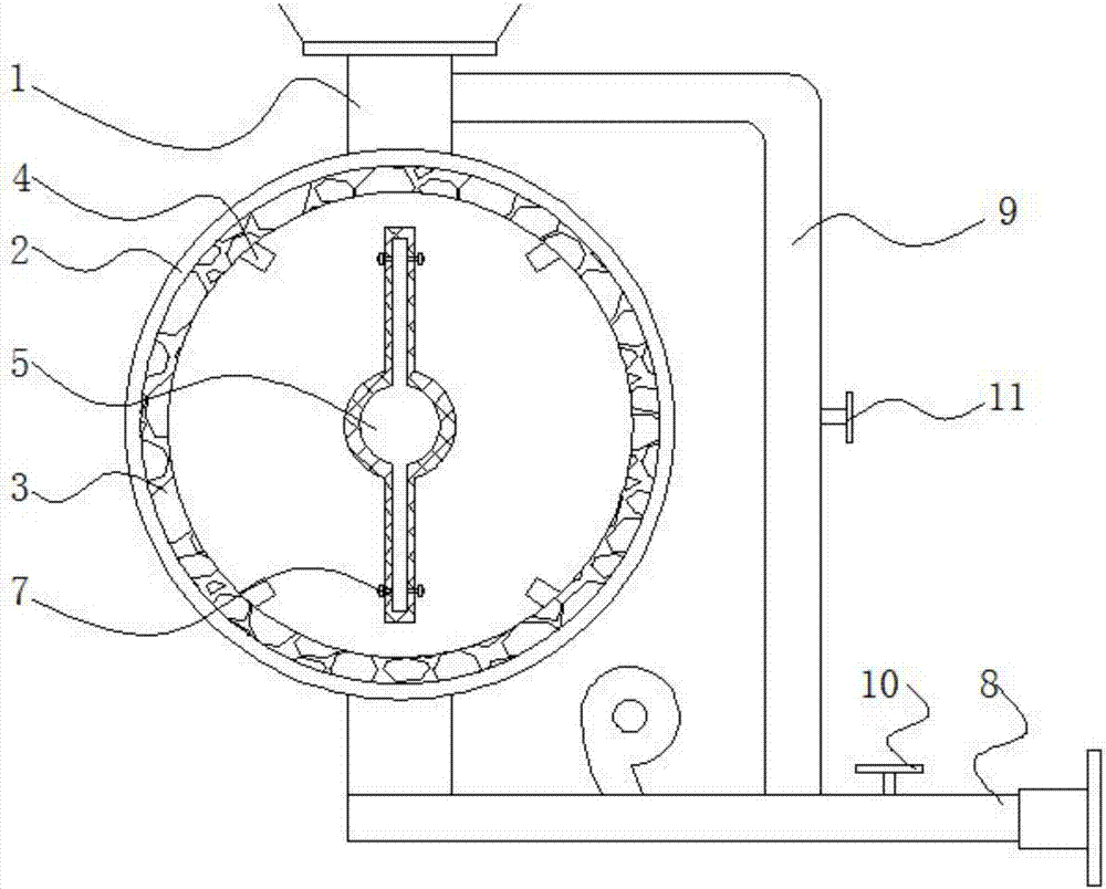 本实用新型公开了一种茶叶静电除杂机的均料辊,包括有进料管和除杂筒,所述进料管连通除杂筒,所述除杂筒内侧壁设有气囊层,所述除杂筒围绕轴线设置出风管,所述除杂筒内设有连接电机的静电辊,所述静电辊的辊体两侧向外延伸设置静电板,所述静电辊和静电板的外部安装过滤网,所述除杂筒连通出料管,出料管上安装鼓风机,所述出料管连通循环管,所述循环管连通进料管,所述出料管靠近出料管和循环管的连接处设置第一阀门,所述循环管上设有第二阀门。本实用新型改进了结构的均料辊,并使之成为静电辊,并延伸设置静电板,能够很好的将茶叶和杂质分开,除尘效果更好,内部后续清洁更方便。