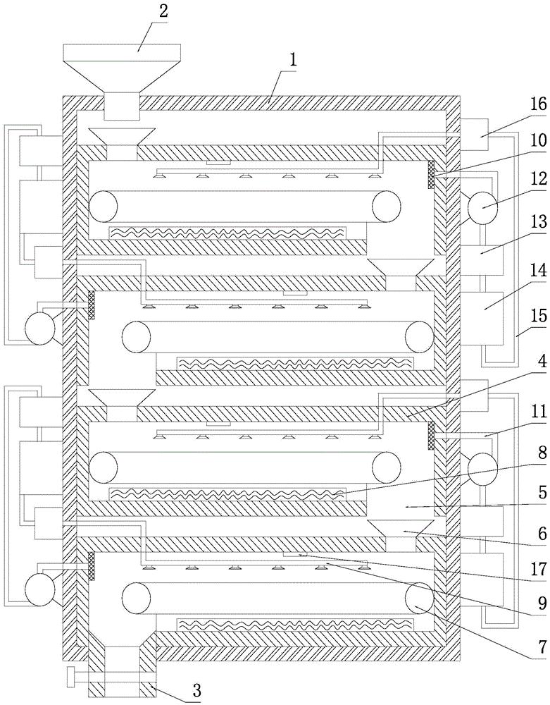 本实用新型公开了一种多级茶叶烘干设备,包括箱体、烘干室、接料斗、输送带、电加热器、喷气管和空气加热器,箱体内部竖直并列设置有多个半封闭的烘干室,每个烘干室对应一组烘干组件,一组烘干组件包括输送带、电加热器、喷气管、引风机、干燥箱、过滤箱和空气加热器,烘干室靠近开口一端设置有引风管,引风管和安装在箱体外侧壁上的引风机连通,引风机的输出端通过管道依次连接有干燥箱和过滤箱,过滤箱的输出端通过循环管和空气加热器连通,空气加热器的输出端通过管道和喷气管连通;该种多级茶叶烘干设备,通过多个半封闭的烘干室的设置,使得茶叶经过多级的烘干室逐渐脱水,有利于提高烘干茶叶的品质。