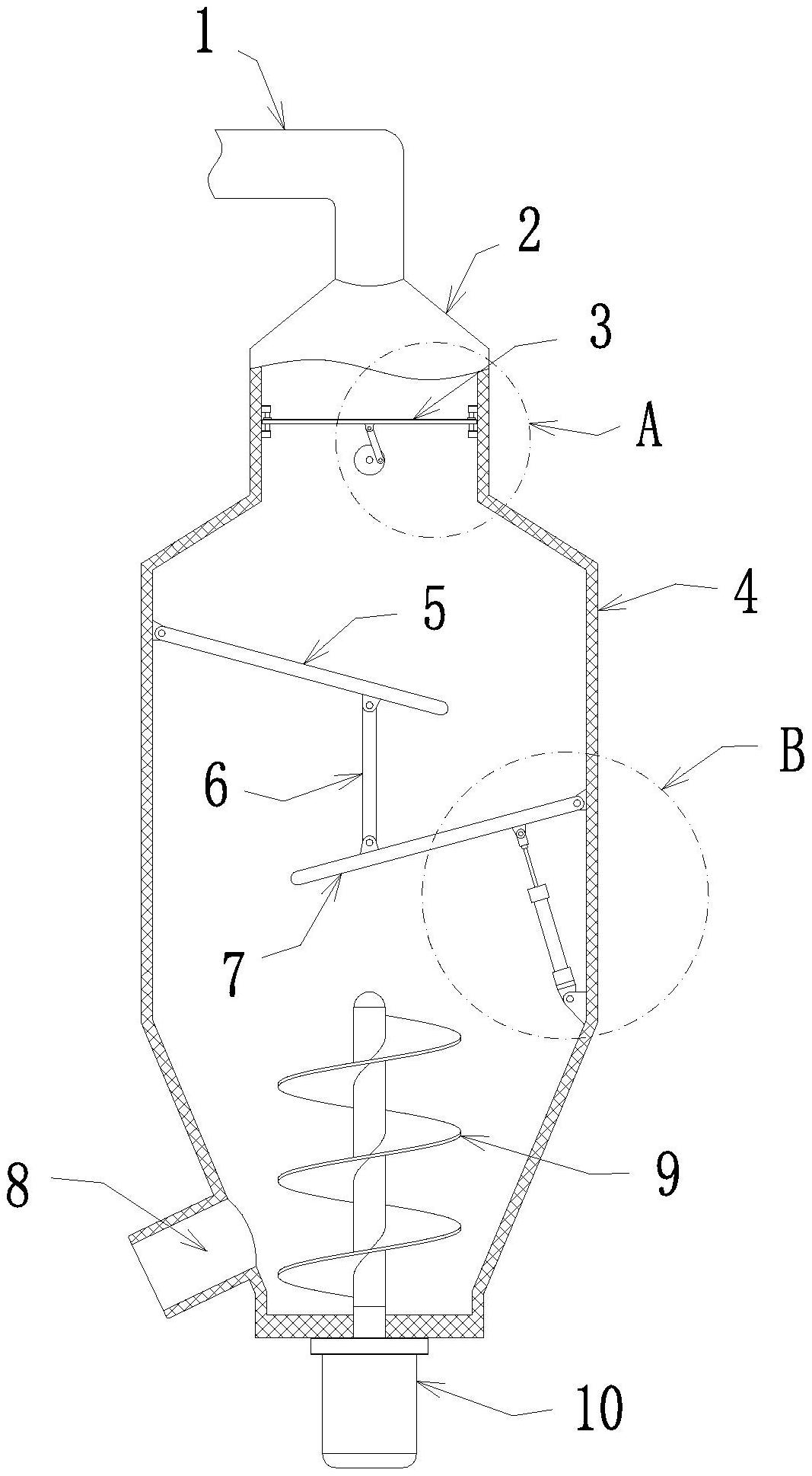 本实用新型公开了拼配机技术领域的一种茯茶加工用拼配机,包括进料管、拼配仓、出料口、搅拌电机、螺旋搅拌片、上落料挡板、下落料挡板、铰链杆,上落料挡板或下落料挡板由驱动单元驱动其沿与拼配仓的铰接处上下摆动,进而使铰链杆带动上落料挡板及下落料挡板上下摆动。通过设置上落料挡板及下落料挡板,能够对进入拼配仓内的茶叶原料进行阻挡,降低茶叶原料落入拼配仓底部的速度,这样使得螺旋搅拌片对茶叶的混合效果较好,通过设置铰链杆及驱动单元,由驱动单元驱动上落料挡板或下落料挡板沿与拼配仓的铰接处摆动,从而能够使上落料挡板、下落料挡板同步摆动,以调节茶叶落入拼配仓底部的速度。