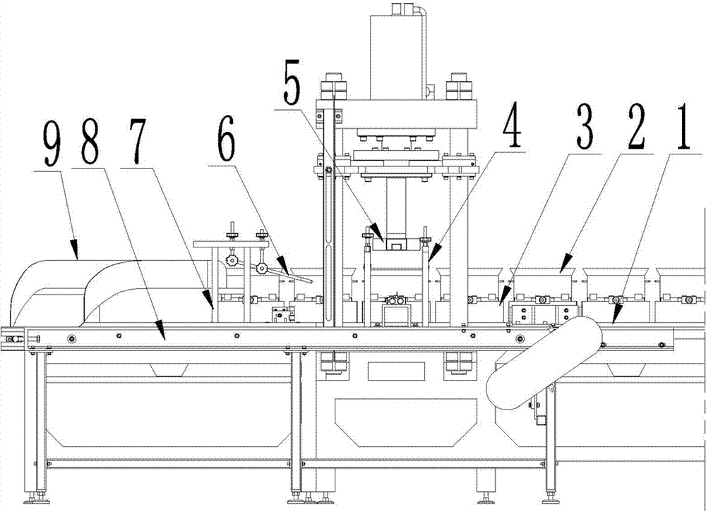 本实用新型公开了一种茶砖生产线取套箱装置,它包括输送带、茶砖模具,茶砖模具开口处装有套箱,套箱的平行于茶砖模具输送方向的外侧壁的下端设有阶台,输送带出料端两侧设压板支架,压板支架连接压板;两压板内侧间距为套箱的宽度;压板支架衔接有提升支架,提升支架上连接提升杆,两提升杆的外侧在水平方向上的间距等于套箱垂直于输送方向上的相邻两阶台外端之间的宽度;提升杆的起始端位于茶砖模具上的套箱阶台处;本实用新型套箱侧壁下端设阶台,设定高度的压板定位茶砖模具,利用提升杆的高度差分离套箱与茶砖模具;调节压板高度用于不同的茶砖模具;压板两端向上弯曲形成夹角,以楔形进口定位插入茶砖模具;滑槽接套箱输送带转移套箱。