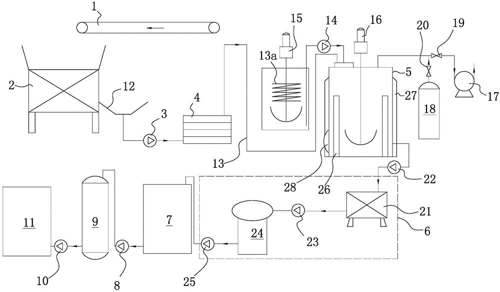 本实用新型提供了一种鲜茶酶解制取绿茶浓缩液的生产线,属于速溶茶生产技术领域。它包括用于输送鲜茶叶的输送带,所述的输送带连接粉碎机,粉碎机连接一号泵,一号泵连接UHT杀菌器,UHT杀菌器连接酶解罐,酶解罐通过二号泵连接固液分离机构,固液分离机构连接缓冲罐,缓冲罐通过三号泵连接真空浓缩器,真空浓缩器通过四号泵连接灌装机。本实用新型可以直接用鲜茶叶制作绿茶浓缩液,产品口感好,风味好,生产成本低。