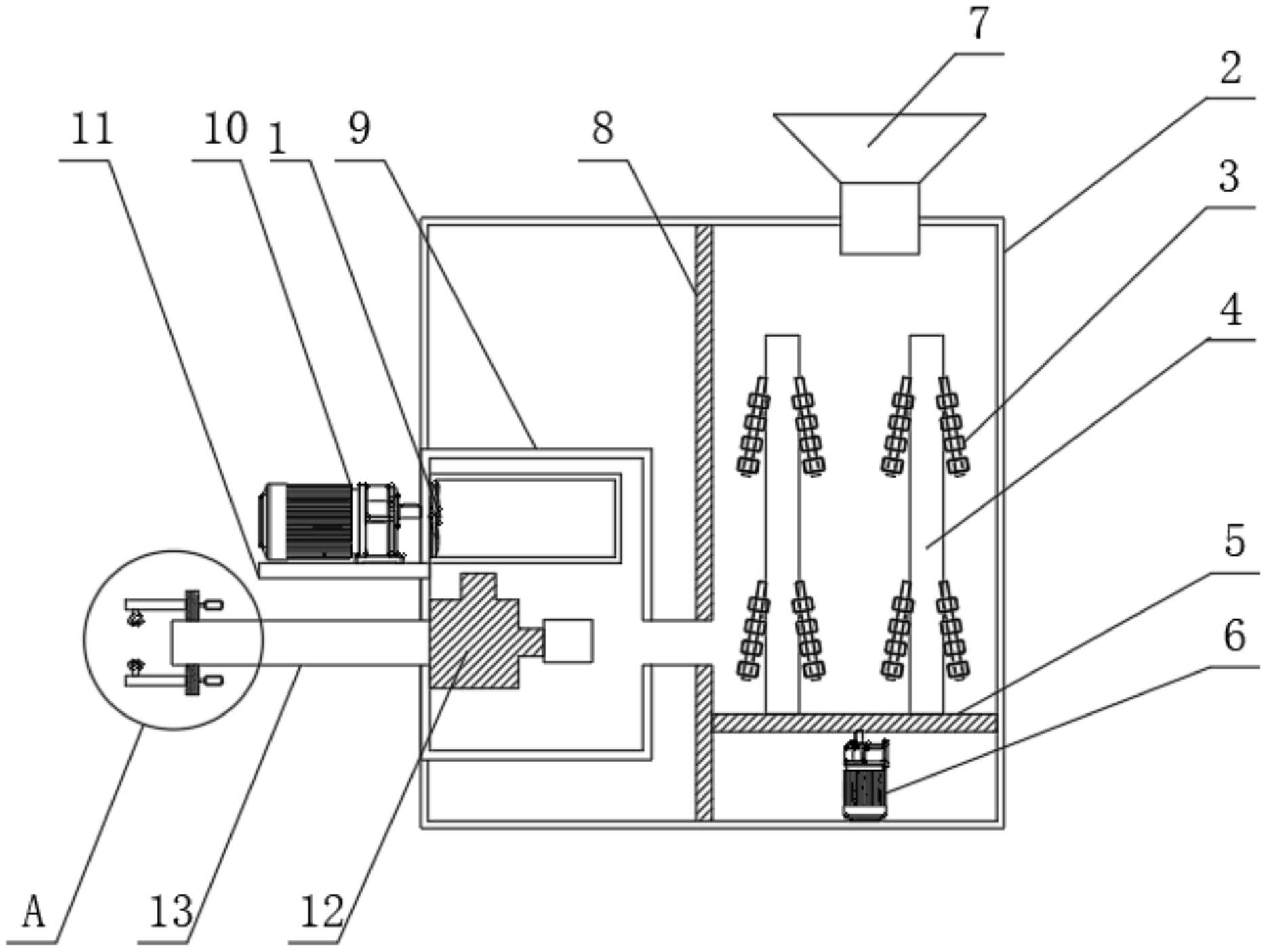 本实用新型涉及填充机技术领域,具体的说是防泄漏的高速自动充填机,包括工作桶,所述工作桶的上端设有进料斗,所述进料斗的下端固定穿插在工作桶的上端,所述工作桶的内部固定有隔板,所述隔板的右端固定有底板,所述工作桶的下端固定有第一电机,所述第一电机的输出轴连接在底板的下端,所述底板的上端固定有若干个转杆,每个所述转杆的上端均固定有链条,所述隔板的左端上固定有内箱,所述内箱的另一端固定在工作桶的内壁上,所述工作桶的左端固定有安置板和软管,本实用新型隔绝了因填充机内部的羽绒内的密度不同从而在填充的时候会导致设备填充的质量不高填充的时候容易造成堵塞的问题,通过了设备的填充效率和质量,加强了设备的实用性。