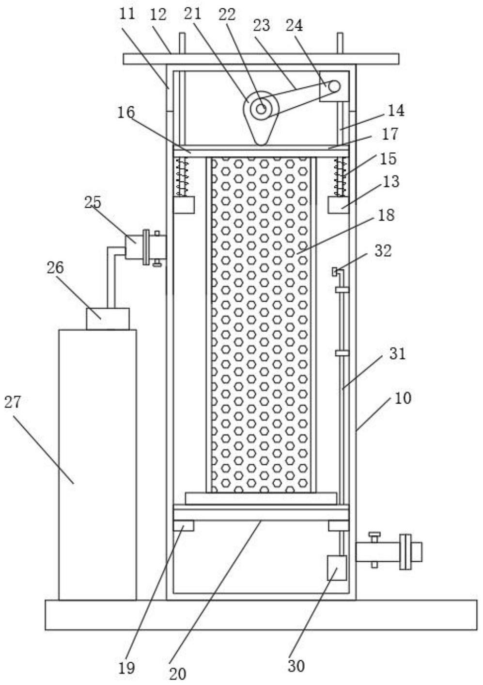 本实用新型公开了一种速溶茶加工用酶解装置,包括釜体和釜盖,所述釜体内壁通过固定块安装有支撑杆,所述支撑杆上套设有弹簧顶板和压板,所述顶板底部固定有筒体,所述釜盖内腔通过转轴安装有凸轮,所述转轴通过皮带连接电动机,所述釜体内腔底部安装有第二水泵,所述第二水泵通过提升管连接喷头。本实用新型结构设计科学合理,通过设置支撑杆、弹簧、凸轮、转轴、皮带和电动机等结构配合使用,可以持续形成震荡效果,使得筒体及内部放置的物料来回上下移动,使得物料与酶解液体充分混合,从而有效加快速溶茶物料的酶解催化效率,进一步加快液体流动速率,保证筒体内部的速溶茶物料快速酶解催化。
