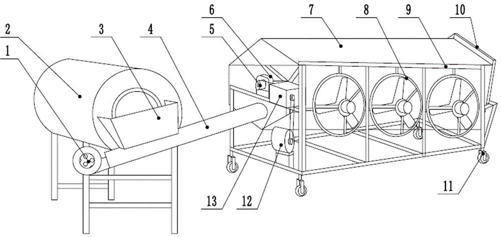 一种茶叶连续杀青旋转式摊晾冷却装置,其包括杀青机、网状滚筒和支架,所述的网状滚筒通过轴承座倾斜安装在支架上,网状滚筒连接有驱动装置;网状滚筒侧面的支架上安装有用于吹风冷却网状滚筒内茶叶的风扇;所述的杀青机的出料口安装有集料槽;集料槽的出料口连通有导管,导管的一端安装有鼓风机,导管的另一端与网状滚筒的高处端连接;茶叶从网状滚筒的低处端排出。本装置能连续对茶叶进行杀青和快速冷却,提高了向揉捻工序供应效能,为最终保证绿茶产品汤色、香气、滋味提供了基础保障。