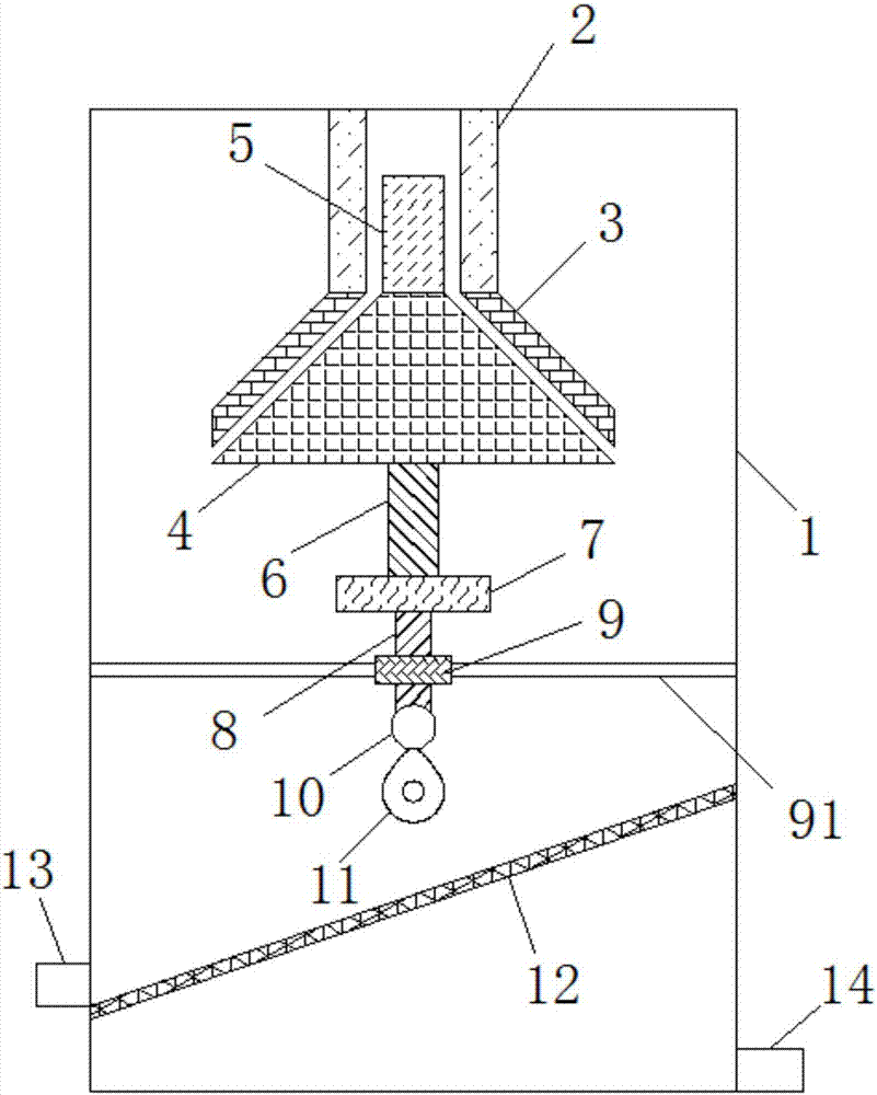 本实用新型公开了一种巧克力原料研磨装置,所述磨盘的下端中部连接有第一转杆,所述第一转杆的下端连接有第一旋转电机,所述第一旋转电机的下端连接有活塞杆,所述活塞杆的中部滑动套接有套管,所述活塞杆的下端连接有从动轮,所述箱体内腔的后侧壁安装有第二旋转电机,所述第二旋转电机的另一端沿水平方向上设置有第二转杆,所述第二转杆的另一端套接有凸轮,所述凸轮的上端与从动轮的下端活动连接,所述箱体位于凸轮的下方设置有斜向下的过滤网,所述箱体连接有位于过滤网斜向下的一端的粗料回收管,所述箱体远离粗料回收管的一端连接有出料管。本实用新型具有结构简单、研磨效率高等特点。