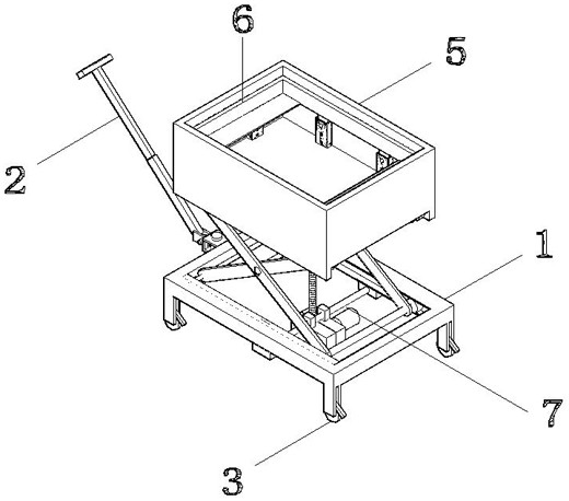 本实用新型公开了一种食品车间转运箱专用板式运输车,涉及运输工具领域。包括移动转向单元、定位单元和高度升降单元;本实用新型通过设置移动转向、定位和高度升降三个功能单元,有效解决了传统转运车在急停或急转弯时,货物容易在底框上滑动,从而使货物从转运车的前面或两侧掉落,以及各工位放置物料的地方高低不同,工人进行装卸时极为不便的问题;本实用新型具有结构简单、成本低廉、使用方便迅速、节省劳力节约时间等优点。