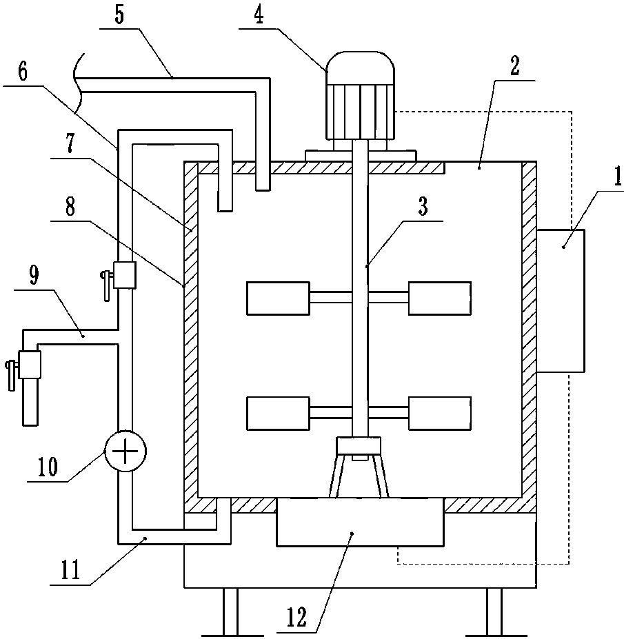 电磁熬糖锅,锅体呈圆筒形,侧壁上设计有保温层,锅体中心设计有带叶片的搅拌轴,搅拌轴的下部活动固定在锅体内底部,搅拌轴的上部连接在锅体外的电机上,锅体上部设计有加水管和加料口,在锅体底部外侧设计有电磁加热器,锅体底部设计有出液总管,出液总管上安装有抽液泵,抽液泵的出管分为两个安装有阀门的支管,其中一个支管为出液管,另一个支管为循环管,循环管的上口接锅体上部,电机和电磁加热器与锅体外侧壁上的电控器连接。采用可以减少热量损失,提高设备使用寿命;出液总管分为循环管和出液管两支,可以在糖液处于保温状态时,用抽液泵将锅体内的糖液快速放出,或者让锅体底部温度较高的糖液循环到锅体上口,保持上下温度的均衡。
