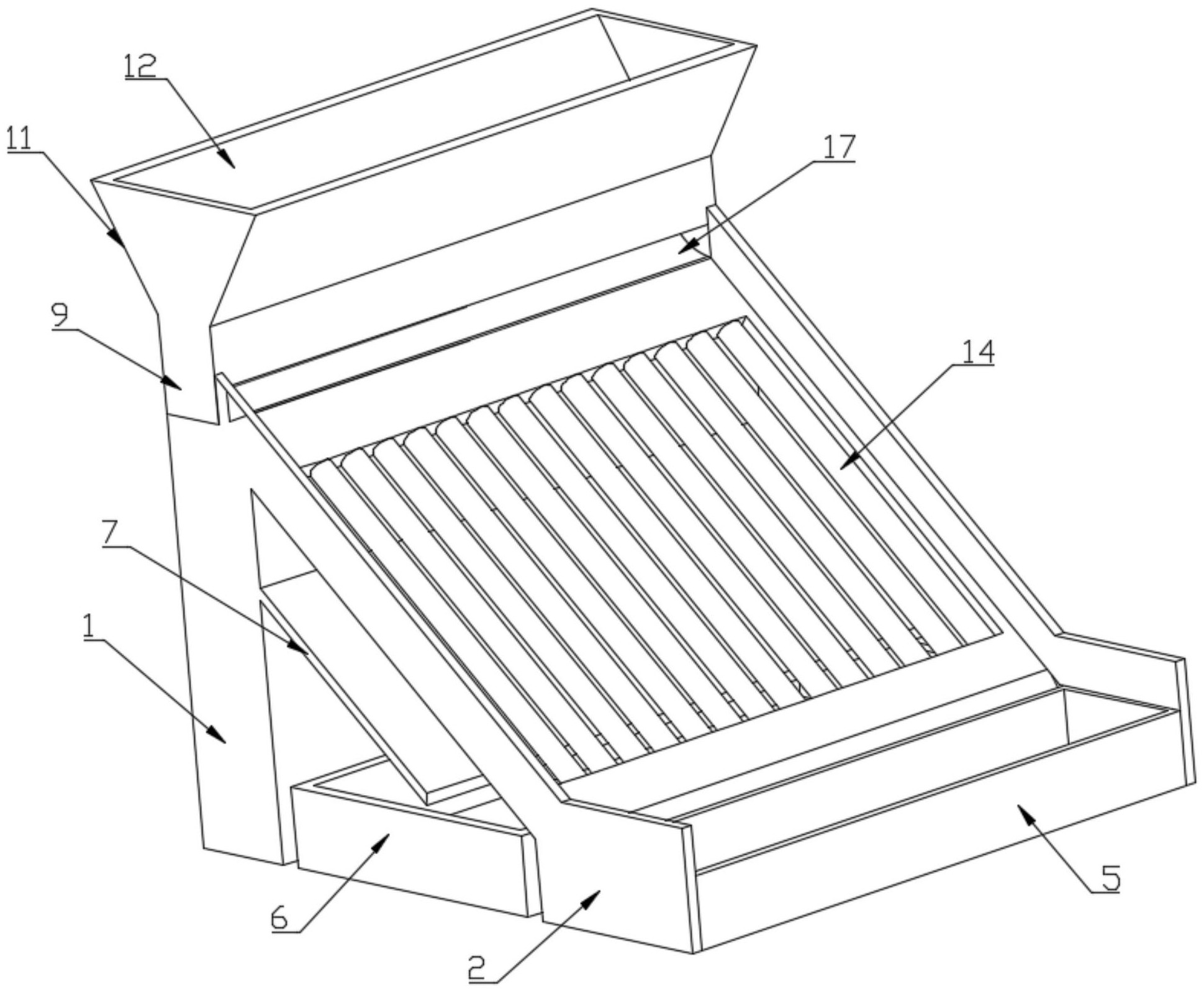 本实用新型公开了一种蛋黄蛋清工业化分离装置,涉及月饼原料加工技术领域,包括后架、前架以及固定安装在后架和前架之间的分离架,所述分离架倾斜设置,且所述分离架上开设有分离口,所述分离口内等间距安装有多个分离柱,相邻的所述分离柱之间设置有间隙,且所述分离架的下方放置有蛋清收集槽,所述后架的顶部固定安装有导料箱,且所述导料箱上一体成型有导料斗,所述导料斗上开设有导料口,且导料箱朝向分离架的侧面开设有与导料口连通的出料口。本实用新型解决了现有的蛋清蛋黄分离装置不利于工业化应用以及容易造成浪费的技术问题,有利于节约成本的同时,适用于工业化应用。