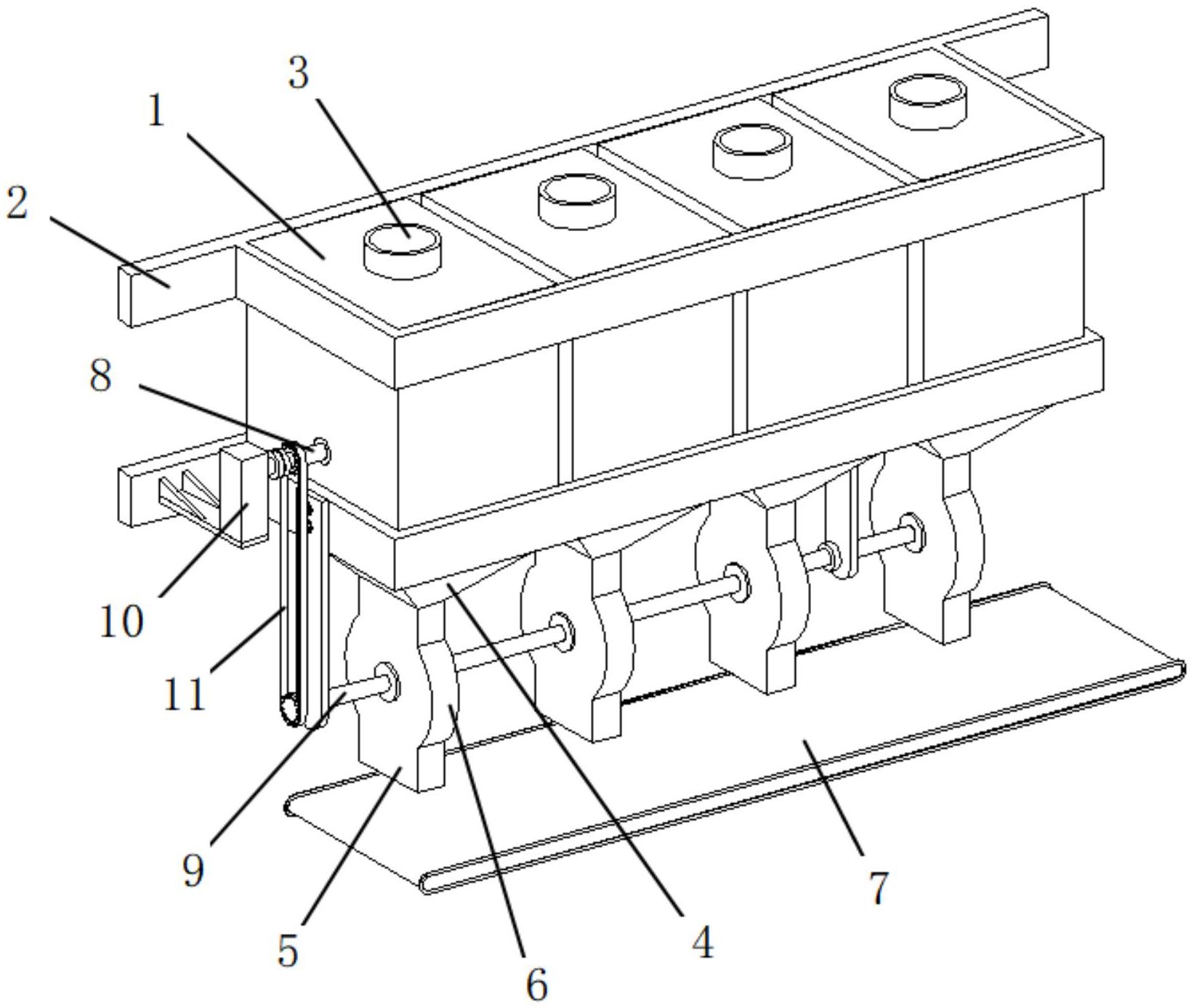 本实用新型涉及食品加工技术领域,尤其涉及一种适用于糕点的配料添加装置,该配料添加装置用于实现固体配料的添加,包括并排分布的若干固体配料仓和位于其下方的传送带,固体配料仓的外侧共同安装有将其连为一体的框架,固体配料仓的顶端设有加料管,底端通过过渡管道连接有矩形下料管,矩形下料管的中部设有柱形壳,固体配料仓中共同穿设有带翻料器的翻料轴,柱形壳中共同穿设有带取料盘的下料驱动轴。本实用新型利用柱形壳和取料盘的配合,实现转动同步取料,取料盘中取料槽体积大小预先定制,使其满足应固体料一次配料的添加量需求,这样每次配料时只要保障取料体积基本一致即可控制添加量,无需每次进行称量。